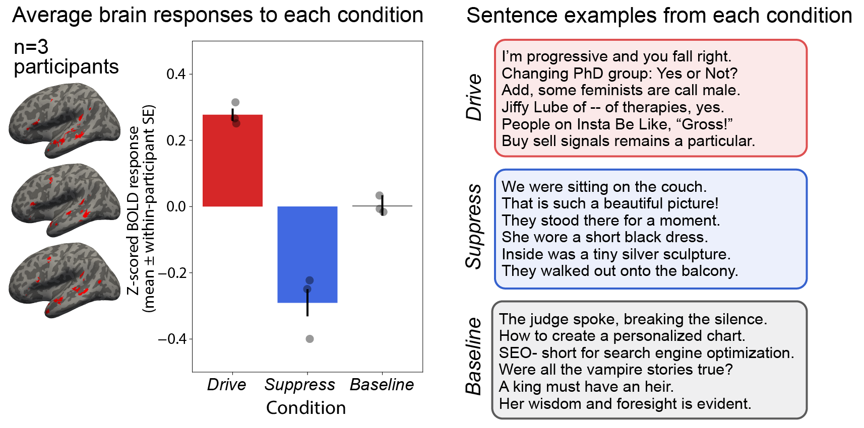 The bars show the normalized language system fMRI activity averaged across the three participants to the “drive” condition (designed to elicit high brain activity), the “suppress” condition (designed to elicit minimal activity), as well as a diverse set of 1,000 sentences (“baseline”). The boxes on the right show examples from each condition.