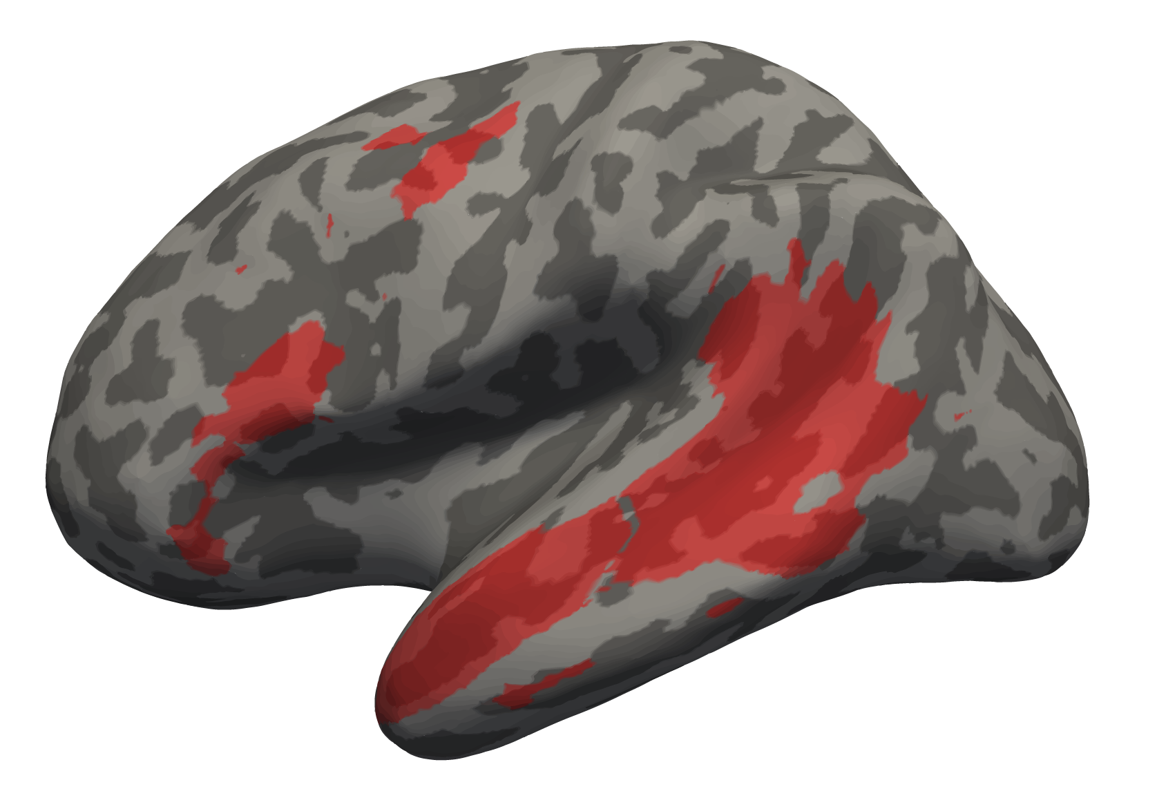 The left hemisphere of a surface-inflated brain. The red demarcations illustrate the typical language areas across many individuals.