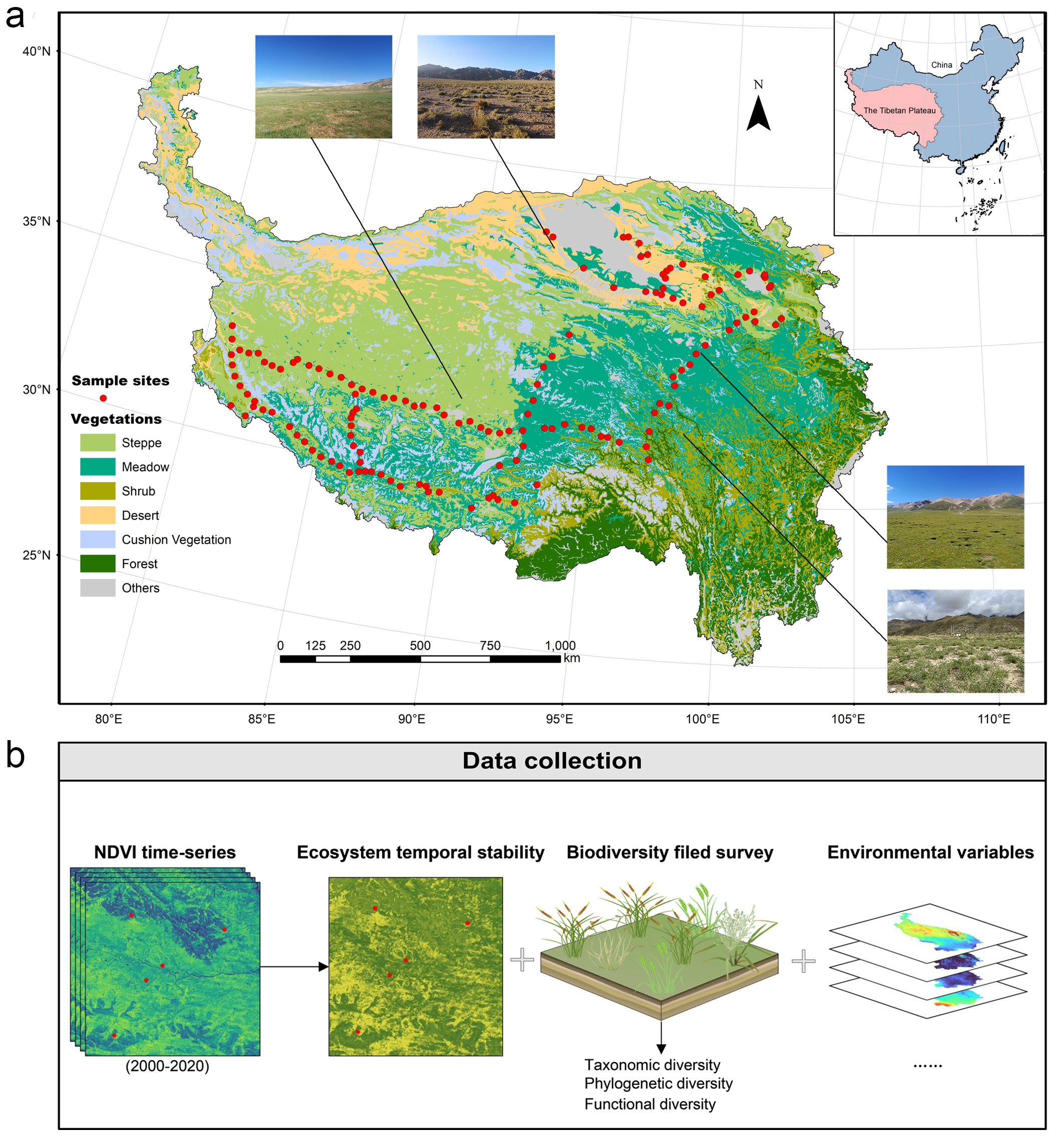 To address this gap, our study aimed to explore the effects of multiple biotic and abiotic factors on ecosystem stability using biodiversity data from field surveys and satellite remote sensing at 143 sites across different ecosystems on the Tibetan Plateau (Fig. 1). We conducted field surveys and plant community sampling during the 2019-2021 growing seasons, and obtained environmental factors from public databases. To measure long-term stability, we used the annual maximum Normalized Difference Vegetation Index (NDVI) from 2000-2020 as a proxy for aboveground vegetation productivity.
