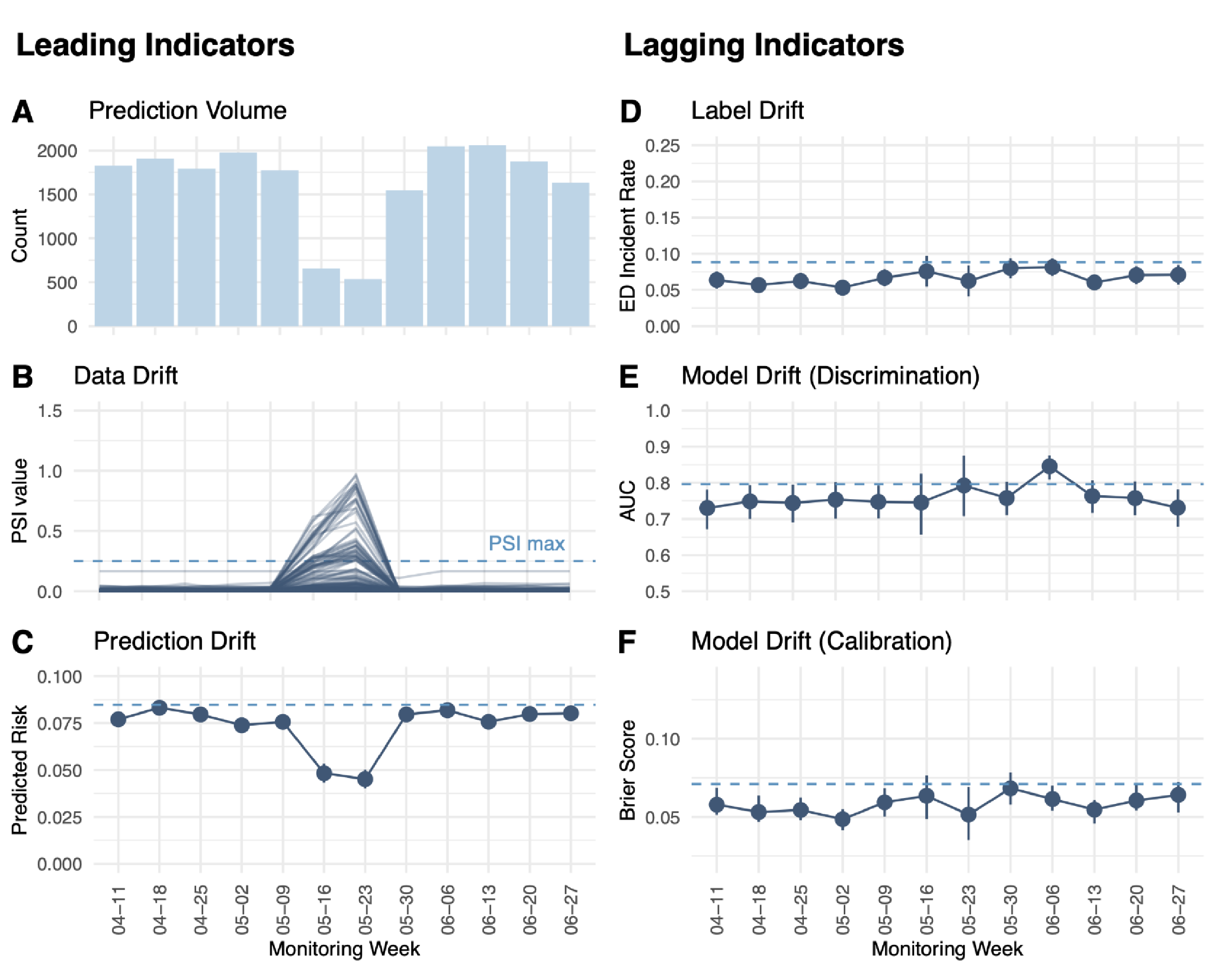 Figure 1. Real-world monitoring of leading and lagging indicators for the ED visit prediction model in production.