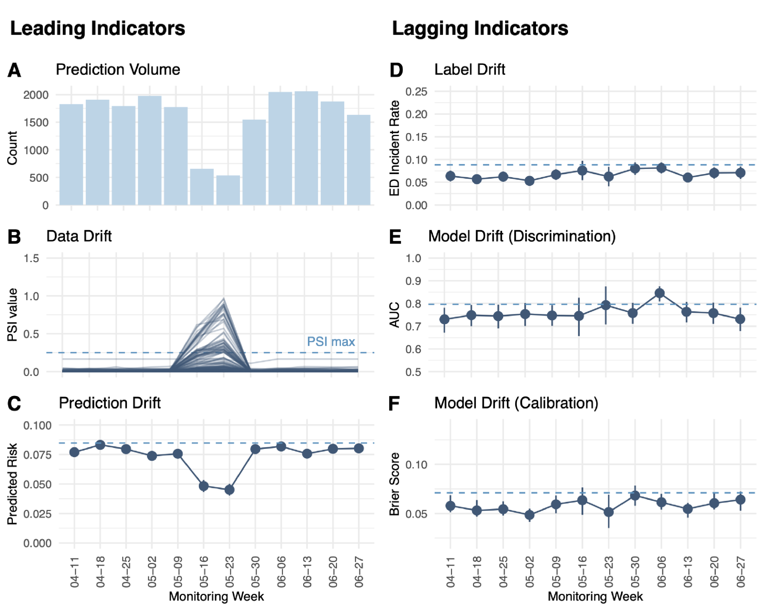 Figure 1. Real-world monitoring of leading and lagging indicators for the ED visit prediction model in production.