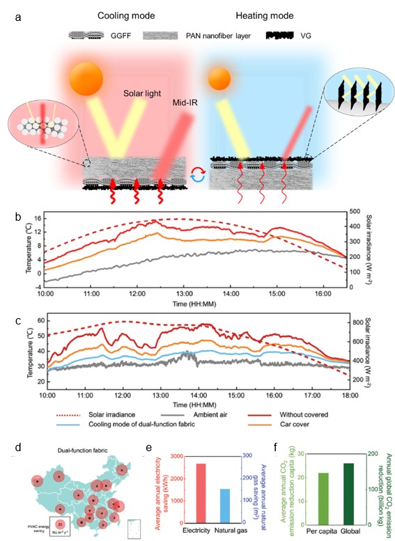 Figure 1. Dual-function fabric with both radiative cooling and solar heating functions. (a) Schematic of dual-function fabric used as a roof coating in cooling (left) and heating (right) modes. (b,c) Practical heating and cooling performances of the dual-function fabric in winter ((b), Beijing, January 7, 2022) and summer ((c), Beijing, June 17, 2022). (d) HVAC energy savings of building with dual-function fabric as roof coating in 16 cities in China. (e) Predicted average annual electricity and natural gas savings for the modeled building. (f) Predicted average annual CO2 emission reduction per capita and globally.