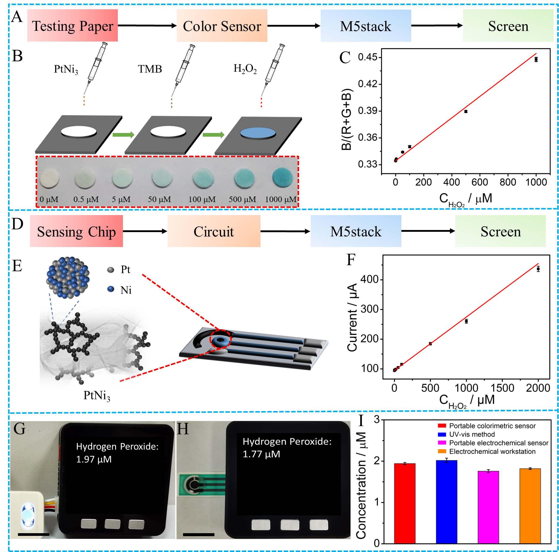The outstanding electrocatalytic characteristics of the PtNi3 hydrogel toward H2O2 was also demonstrated in this work. Finally, we utilized the PtNi3 dual-structure hydrogel to construct a portable biosensor which can support both the visual and electrochemical testing modes (Figure 3). Considering the importance of H2O2 analysis in the living cells, we used these two modes of portable sensor to measure the H2O2 content in the CHAPS-stimulated HeLa cells. The testing results were verified by the standard instruments, demonstrating the reliability of the developed sensing platform.