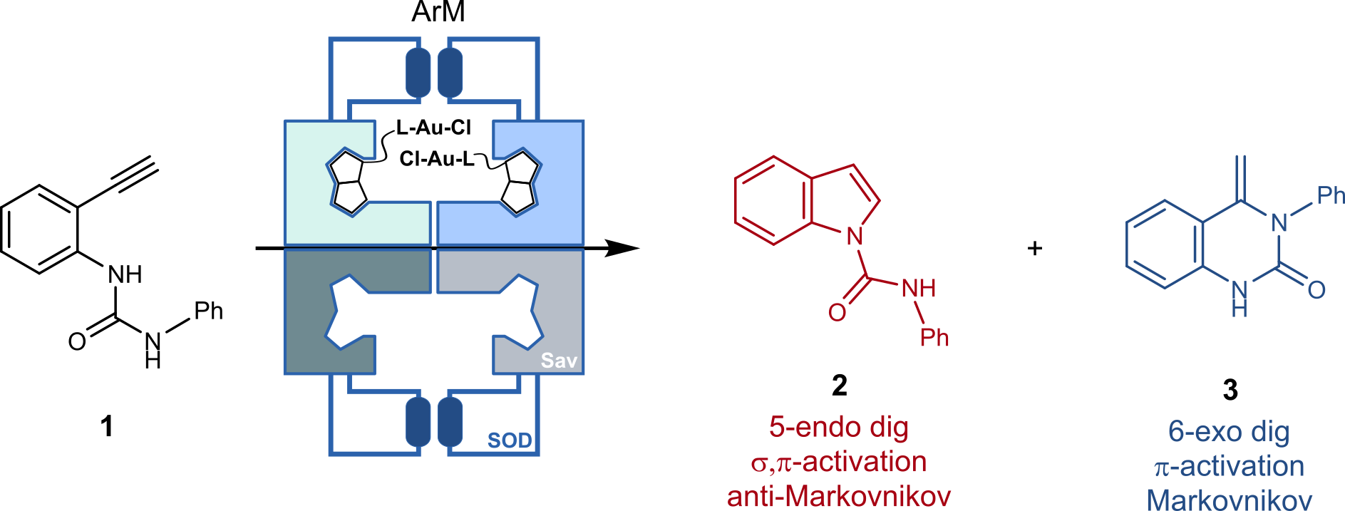 Figure 1 A biotinylated gold complex combined with a chimeric streptavidin (Sav) endowed with a hydrophobic lid borrowed from SuperOxide Dismutase (SOD) catalyzes the regioselective hydroamination of substrate 1 to afford either the indole 2 or the quinazolinone 3 depending on the activation mode.
