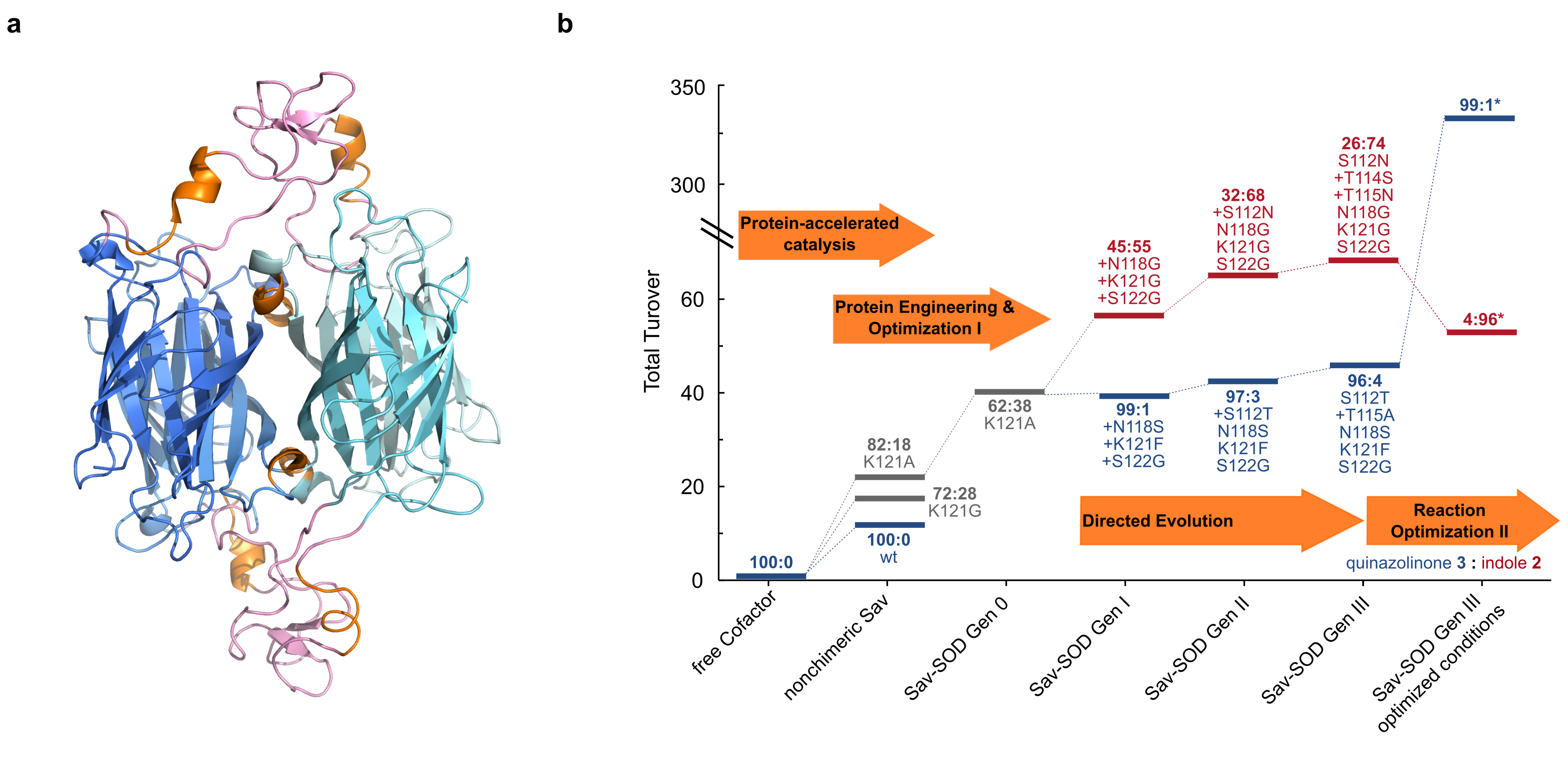 Figure 2 a Computed structure of the chimeric Sav-SOD resulting from a 200 ns MD simulation. b Evolutionary trajectories of Sav-SOD mutants for the hydroamination of substrate 1 to form either indole 2 or quinazolinone 3 (the product ratio 3:2 is displayed in bold).