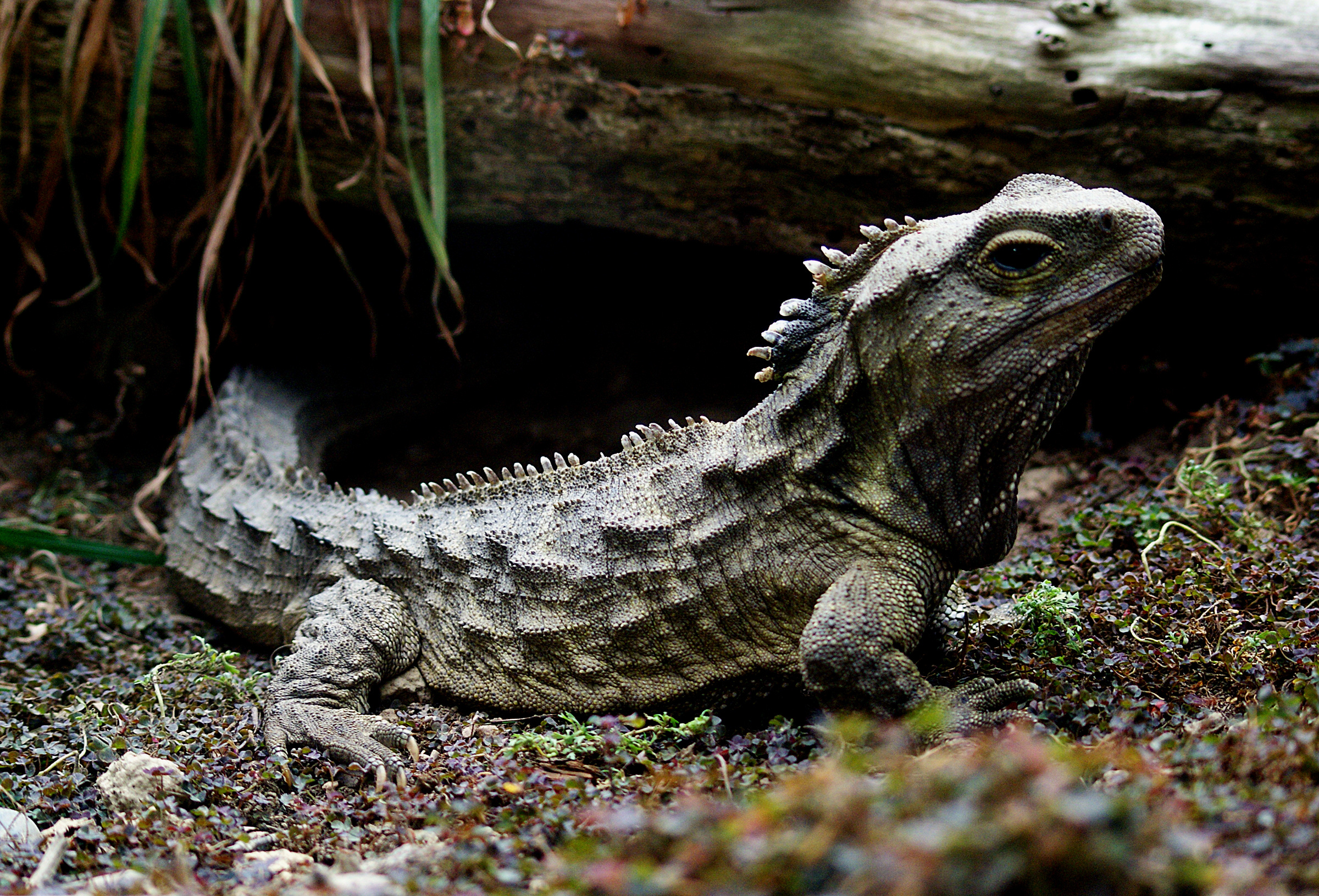 Adult Tuatara adjacent to its burrow in New Zealand, note the textured skin and unique posture.
