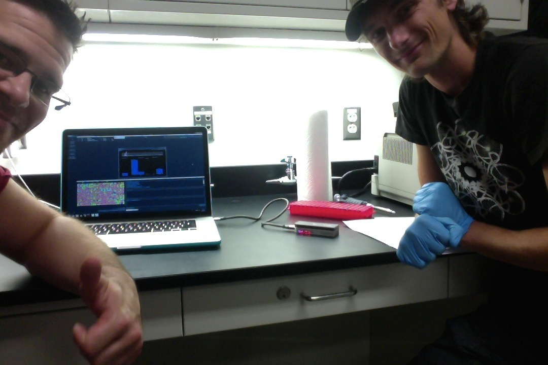 Charles Barbieri (left) and Damon Tighe of Bio-Rad (right) conducting the first Oxford Nanopore run in June 2014 at the Peralta Genomics Lab. Note, the small Oxford Nanopore device in the middle hooked up to a laptop.
