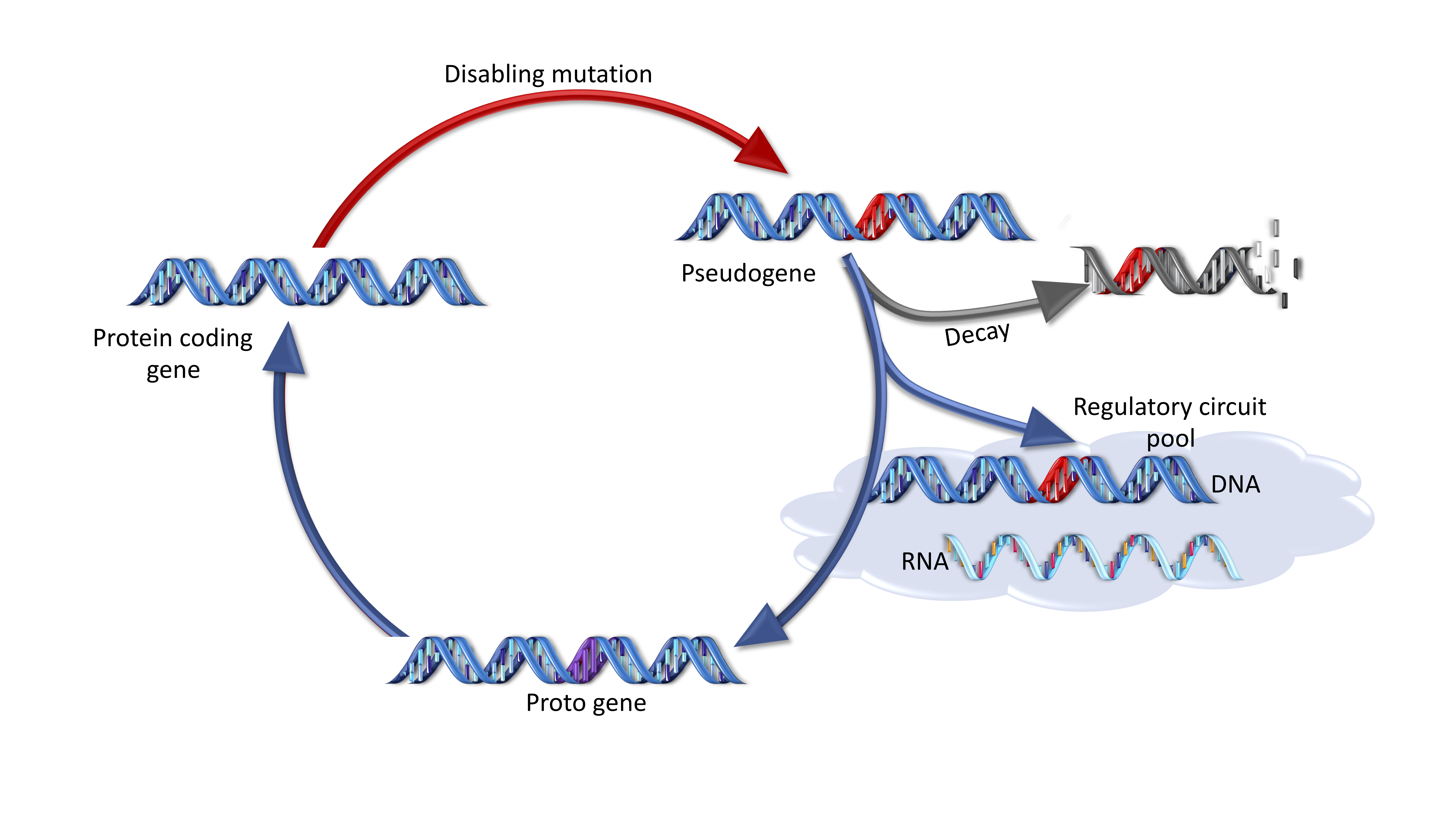 Through their formation, degradation and reviving potential, pseudogenes are part of a complex biological circle (see Figure 1). In most cases, the acquisition of a disabling mutation is synonymous to a death sentence. As soon as they are formed these new pseudogenes are prone to decay and are slowly removed from the genome. However, some do retain a number of features commonly associated with functional protein coding genes, allowing their transcripts and RNA products to contribute to genome activity by entering the regulatory circuit. And then, through the same evolutionary chance, some pseudogenes acquire new mutations that revert the initial disablement and even provide new functions to the emerging proto-genes, giving once an extinct gene a new chance to life.
