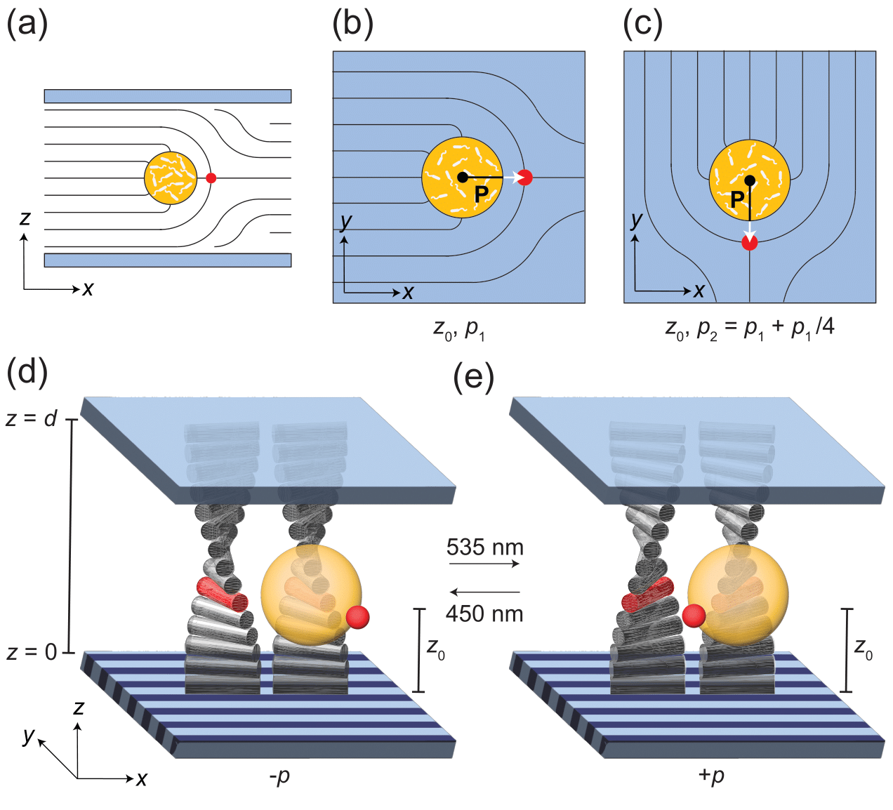 Microscopic active droplets are of interest since they can be used to transport matter from one point to another. In our research, active droplets represent droplets of water with thousands of swimming bacteria Bacillus subtilis inside them. These droplets can be stabilized by surfactants in oil-like environment. When the environment is isotropic, the droplets show random displacements, similar to classic Brownian motion, and produce no directional transport. However, when placed in an anisotropic oil environment, namely, a nematic liquid crystal with molecules that tend to align parallel to each other, active droplets show a remarkable ability to propel themselves over long distances. The trajectories run parallel to the surrounding molecular orientation of the liquid crystal. The propulsion is unidirectional, because the liquid crystal creates a polar “cloud” of molecular orientation that breaks the fore-aft symmetry, see Figure below. The flows created by the randomly swimming bacteria inside the droplet transfer through the interface into the nematic surrounding. The fore-aft asymmetry of molecular orientations around the droplet rectifies these chaotic flows into a directional flow of the nematic outside the droplet. As a result, the droplet propels unidirectionally. The grand challenge is how one can dynamically steer the droplet into a desired direction. In the past, static control of propulsion was achieved through surface patterning of the orientation of the liquid crystal. In our work, we proposed a dynamic non-contact method to control the propulsion direction of active droplets by placing them in a photoresponsive cholesteric liquid crystal environment. A cholesteric is a chiral version of the nematic liquid crystal. The molecules are arranged in nematic-like layers that stack on top of each other; the direction of molecular orientation twists from one pseudolayer to the next. This helical supramolecular structure is characterized by a pitch p, which is the distance over which the molecular orientation twists by 360°. The pitch of the cholesteric can be tuned by light if the material is doped by photosensitive molecules that change their conformations upon irradiation; the helicoid can even be completely unwound. For example, the cholesteric material developed in our laboratory changes the sense of rotation from left-handed to right-handed when exposed to blue light and in opposite direction when exposed to green light, as shown in the Movie below. When the pitch changes, the axis of the fore-aft asymmetry rotates. As a result, an active droplet suspended in a cholesteric bulk realigns its trajectory since the latter is always parallel to the fore-aft asymmetry axis.