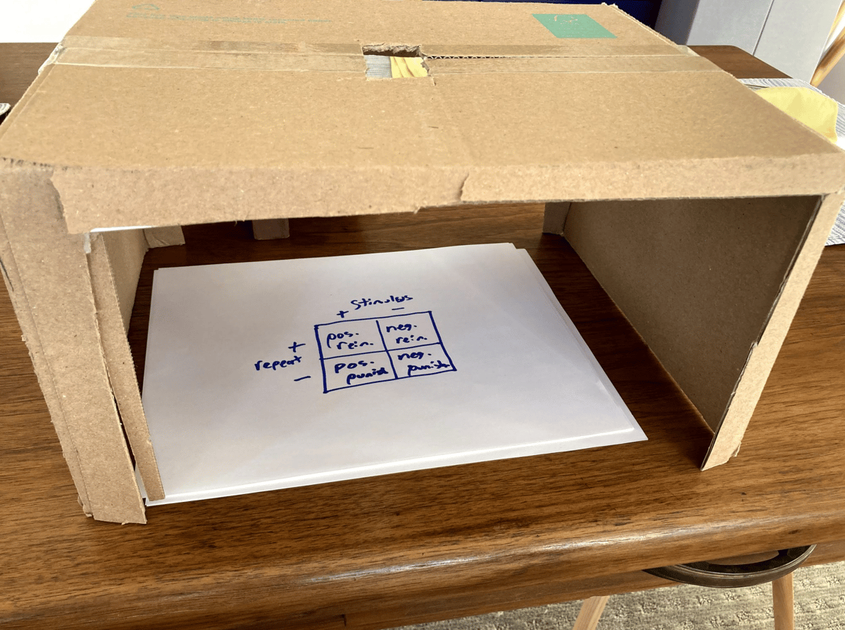 My friend said she planned on using these videos with her high school psychology class, so I hope to get some real feedback from students about how useful these videos and diagrams are. By the way, if any of you want to make similar videos, here’s the very complicated “filming rig” I made out of a cardboard box (I put my cellphone on top with the camera pointing down through the hole).