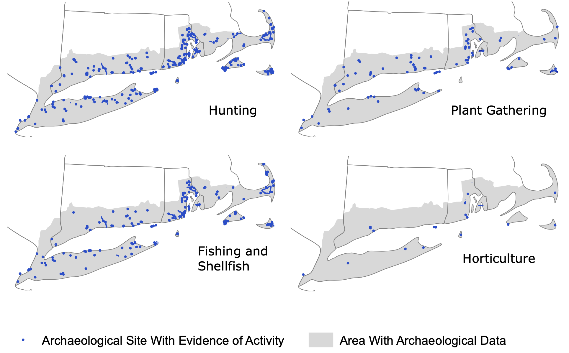 Archaeological research in SNE has revealed millennia of flexible settlement patterns, diverse subsistence activities, and fluid social boundaries (e.g., Chilton, 1999; 2002; 2004; 2010; Chilton and Doucette, 2002; Chilton and Hardy, 2014). Before European colonization, the Indigenous Peoples of SNE lived in flexibly sized groups and shifted activities seasonally, reusing encampments and logistical sites within well-established homelands. Seasonal/multi-seasonal settlements were densest in areas of plentiful resources (e.g., river valleys, near large wetland systems, and along coastal marshes and estuaries), which were often places of cultural and social significance. Foods were abundant and varied, including large and small mammals, birds, fish, shellfish, tree nuts, and hundreds of plant species. Horticulture featured native plants and tropical cultigens, including maize after ~1000 years ago, but in general horticulture was limited in scale and was supplemented by other food sources; there is no evidence that the Indigenous Peoples of the region ever adopted the large, permanent, agriculturally centered villages and lifestyles characteristic of Indigenous groups to the west and south of SNE (Chilton and Hardy, 2014). Oswald et al. (2020) presented maps of subsistence activities at >1800 archaeological sites across the coastal area of SNE (Figure 1), showing the complex lifeways of tens of thousands of people over thousands of years; SNE was far from “terra nullius” (Turner and Reid, 2022).