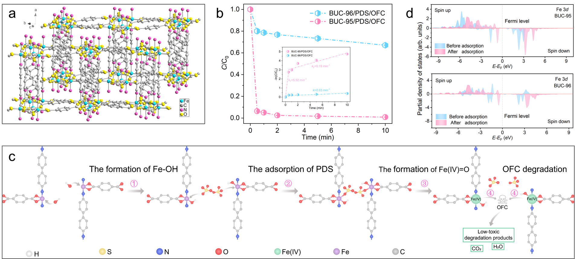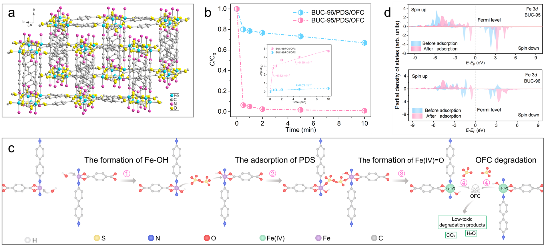 Figure: (a) Flexible dynamic stretching in the homointerpenetrated BUC-95 structure. (b) OFC removal in different reaction systems. (c) The schematic diagram of Fe(IV)=O generation and OFC degradation mechanisms in BUC-95/PDS system. (d) PDOS of Fe 3d before and after PDS adsorption for BUC-95 and BUC-96. Image author: Prof. Dr. Chong-Chen Wang