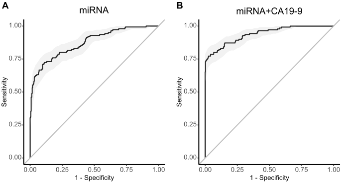 Figure 1. ROC curve for the performance of (A) miRNA model and (B) miRNA+CA19-9 model in the validation cohort using the in-house library preparation kit.