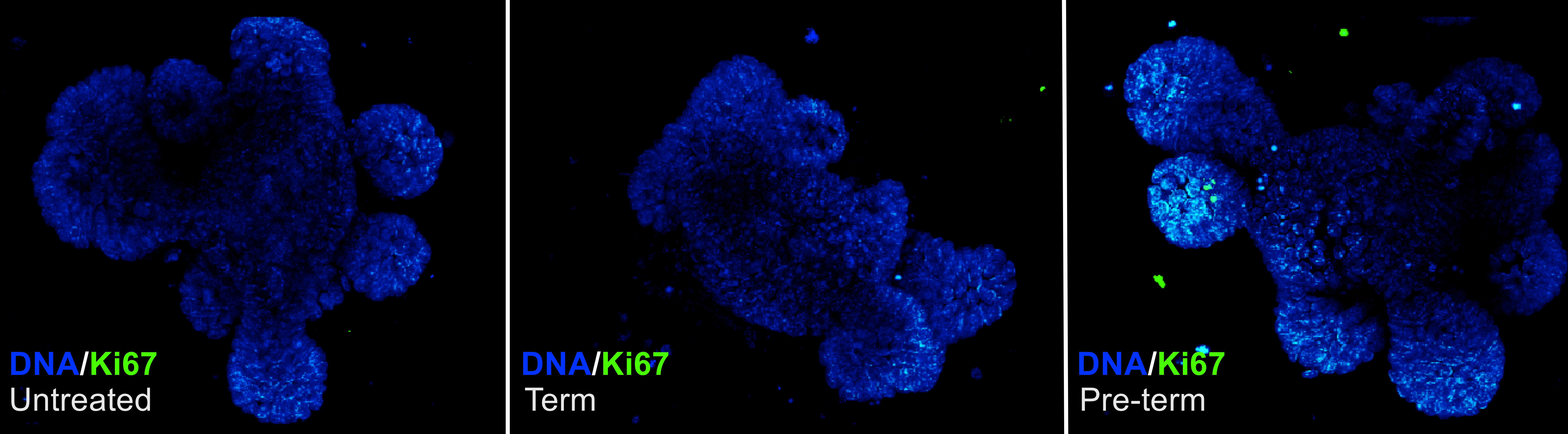 To examine how these metabolites functionally affect the intestinal epithelium, we cultured small intestinal organoids with term and pre-term fecal metabolites. These organoids form “mini-guts” derived from intestinal stem cells which recapitulate epithelial morphology and cellular heterogeneity. Surprisingly, when cultured in the presence of pre-term fecal metabolites, we observed increased proliferation (fig. 1) and stem cell activation relative to term fecal metabolites without activation of inflammatory signaling pathways.