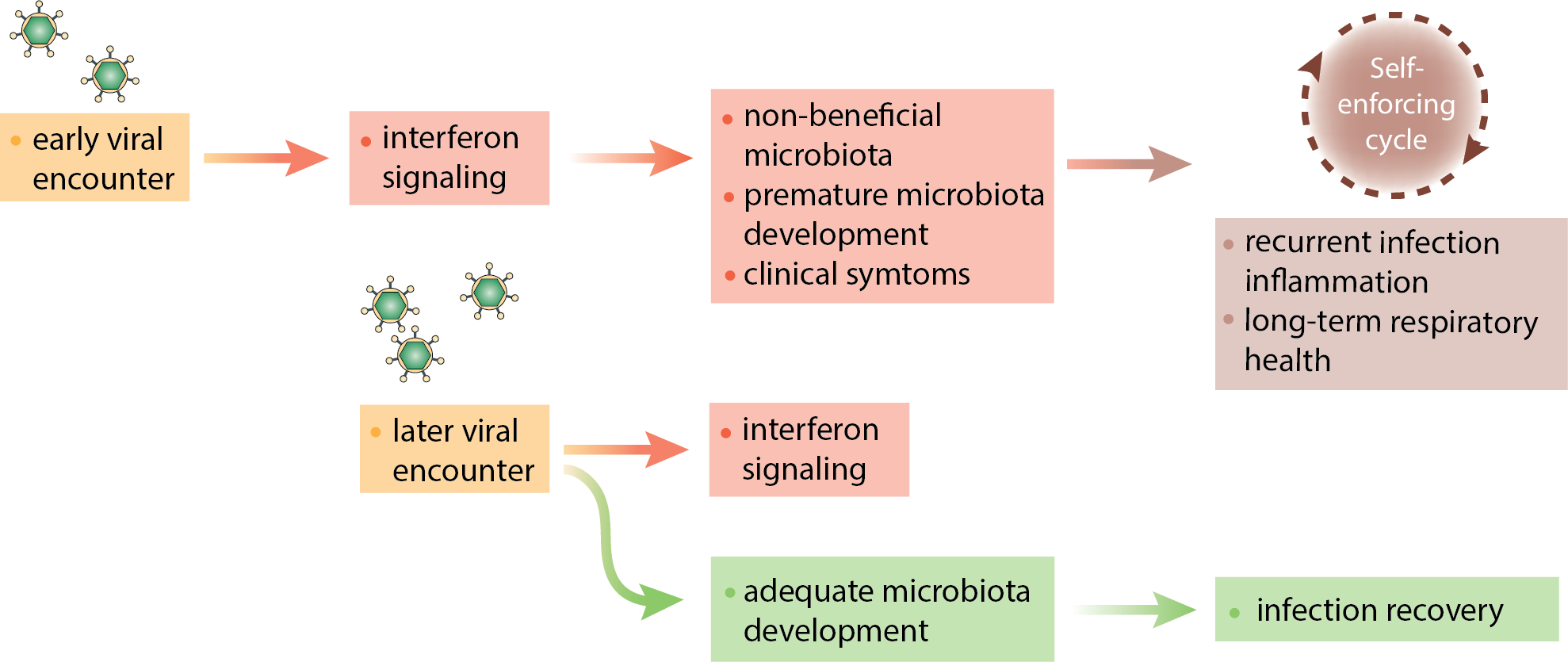 Although we could not confirm causality, we believe we unveiled an important pathway explaining infant infection susceptibility. First viral encounters trigger antiviral interferon pathways, which result in premature microbial development, setting off a self-enforcing circle of inflammation and further microbiota changes, rendering an infant more susceptible to subsequent (viral) infections. Alternatively, upon later first viral encounters, the respiratory microbiota already went through an age-appropriate development, possibly dampening downstream disadvantageous effects of interferon signaling (see Figure). As said, more work is required to further substantiate this plausible chain of events.