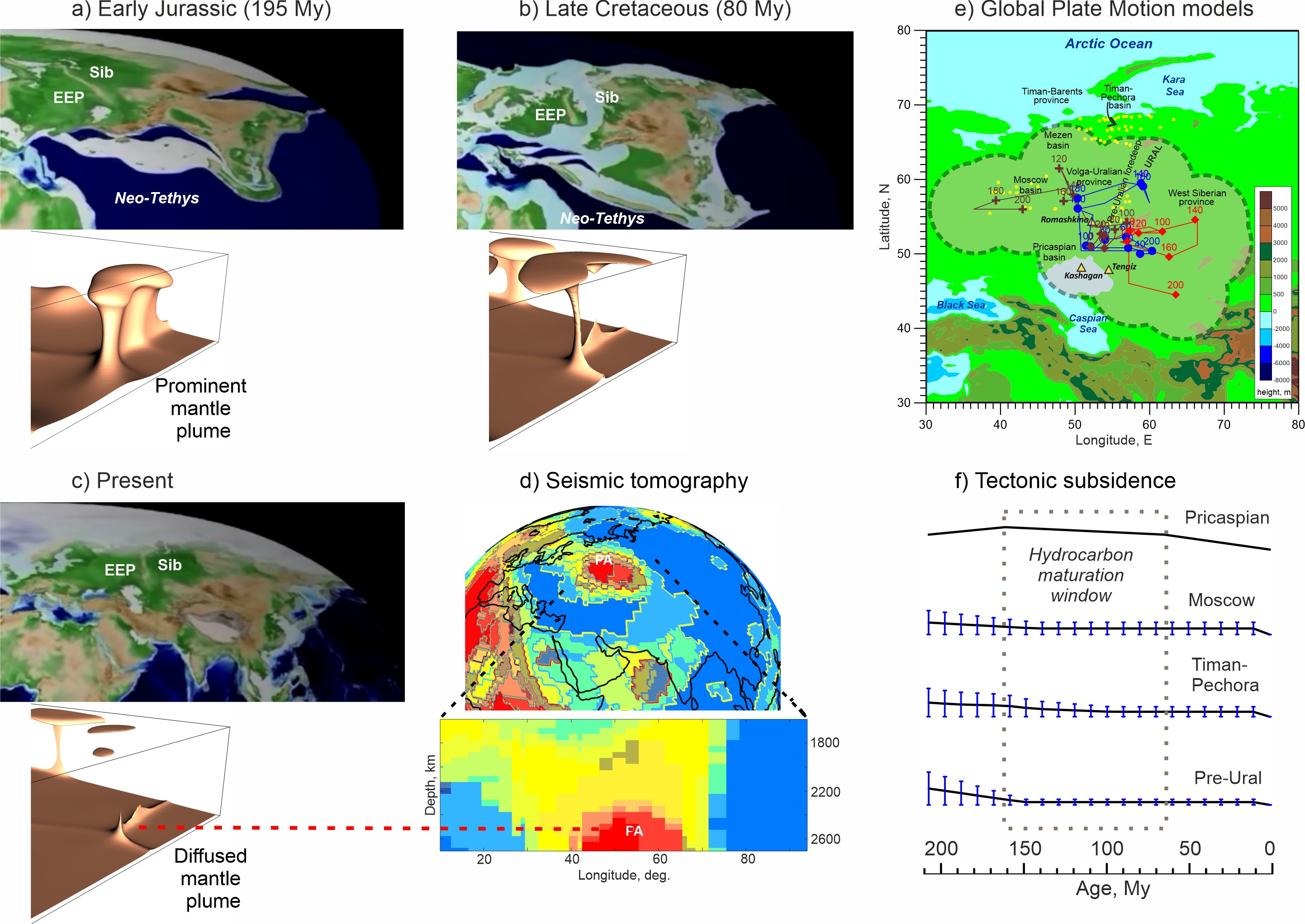 Using mantle plume modelling and global plate motion reconstructions, we have demonstrated that the East European lithosphere is likely to have been located above the weakening (due to a diffusive decay) Perm Anomaly upwelling for approximately 150-200 million years ago, as indicated in the accompanying Figure. As the East European platform moved over the Perm Anomaly during the post-Jurassic period, the vertical tectonic movements recorded in sedimentary hydrocarbon-rich basins indicate either uplift (no sedimentation) or insignificant subsidence. The analysis of heat conduction across the lithosphere reveals that the basins have experienced prolonged heating due to the Perm Anomaly upwelling, resulting in favourable circumstances for the maturation of hydrocarbons.