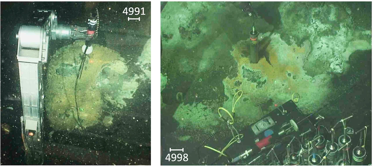 Figure 1. The Cathedral Hill site (4991) and Marker 14 (4998) sites are covered with white, yellow and orange mats of sulfur-oxidizing bacterial mats (Beggiatoaceae). The two sites differ by temperature gradient. Scale bars are 10 cm based on Alvin’s laser beam scaler and the diameter of Alvin pushcores. Courtesy of Andreas Teske, U. North Carolina, Chapel Hill/NSF/AUV Sentry/2016 ©Woods Hole Oceanographic Institution.