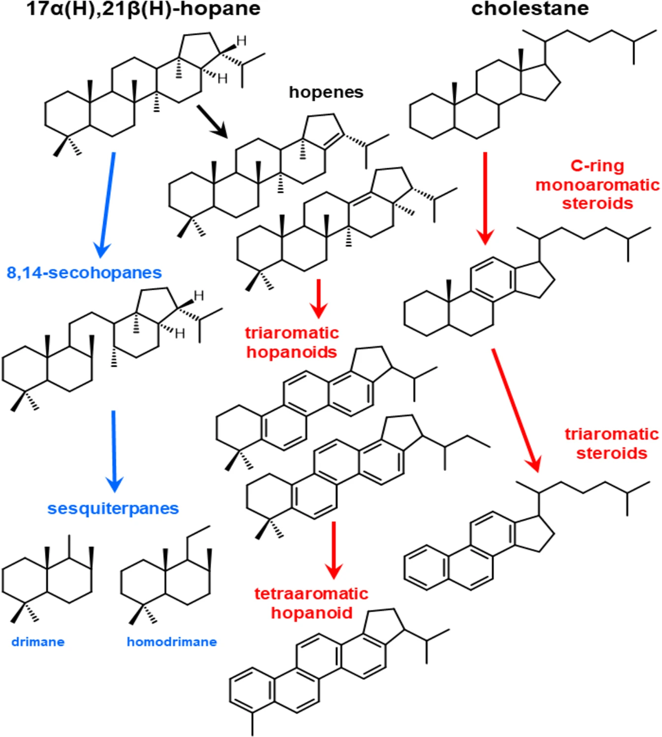 Figure 2. Overview of hopane and sterane biodegradation and oxidation pathways in Guaymas Basin organic rich sediments. Blue arrows indicate microbial biodegradation transforming hopanoids to sesquiterpanes, and red arrows indicate abiotic oxidation to form aromatized hopanoid and steroid compounds. Conceptual model provided by Robert K Nelson.