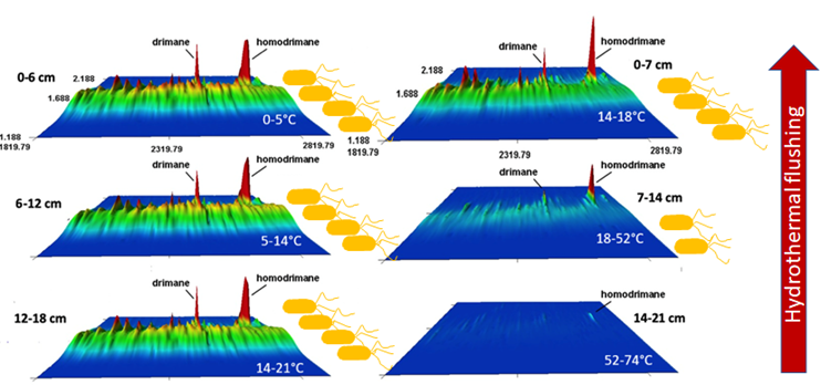 At our temperate site (21oC; Cathedral Hill) the detected biomarkers/biomarker-derivatives can be present throughout the investigated sediment depths. In contrast, at the hot site (> 50oC; Marker 14) these biomarkers exist primarily in the surficial sediment (0-7 cm) and disappear rapidly below the surface. It seems that in the hot, highly active hydrothermal sediments, the entire suite of biomarkers and their alteration products is shifted upwards and concentrated in the surface. This implies potential hydrothermal flushing of the biomarkers from the deeper sediment depths to the surface, as has been known to occur for sedimentary organic matter in the Guaymas Basin 10.