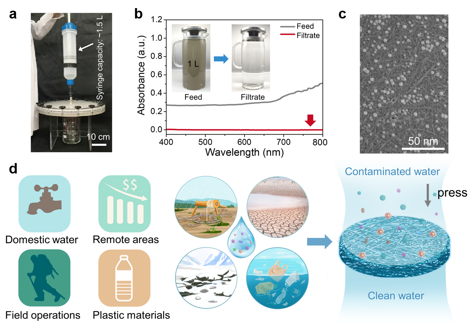 Figure 2. a) Digital photo of the scalable BNHF. b) UV-vis spectra of the feed and filtrate of the dirty river water through BNHF. c) SEM image of the surface of cellulose nanofiber film after filtration of the nanoplastic-contaminated water. d) Schematic demonstration of the representative areas requiring particle-contaminated water purification, including domestic water, water in remote areas, field operations, and water in contact with plastics.