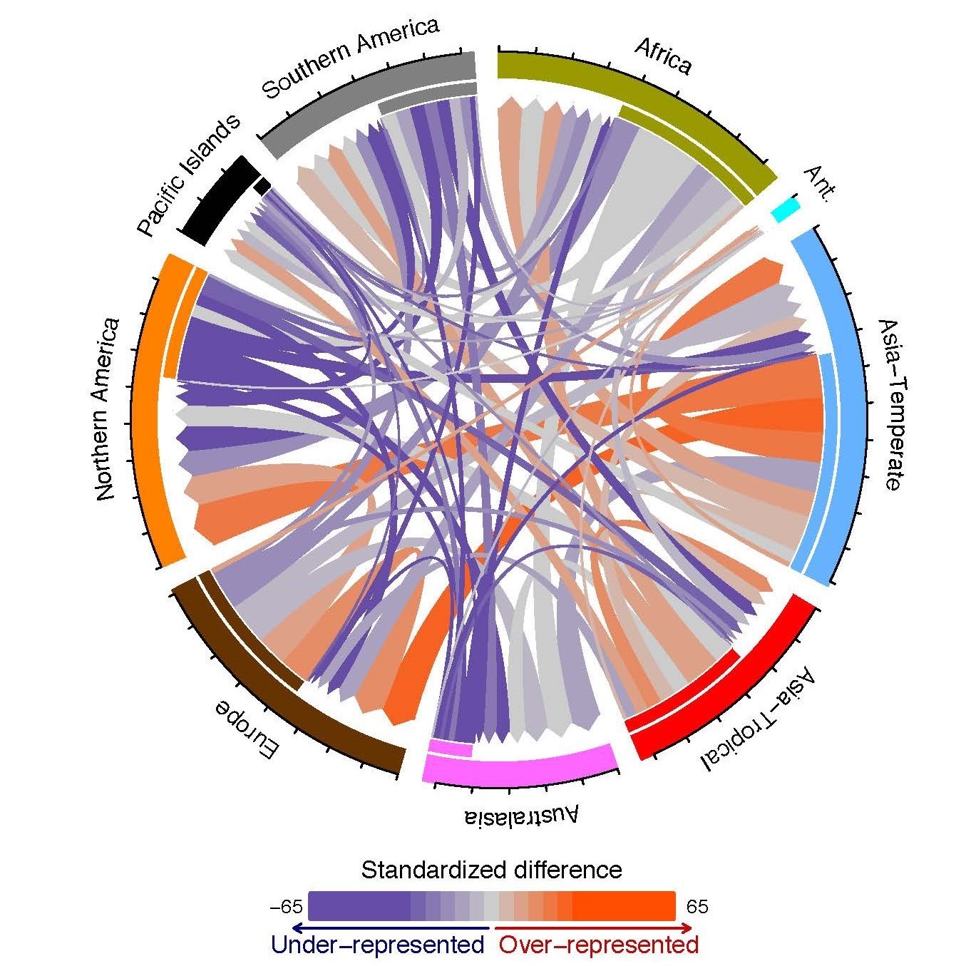 Flows of naturalized economic plants among the continents. Each tick interval along the outer circle corresponds to 1000 taxa. The colors of the flow arrows indicate whether the flows are larger (red color tones) or smaller (blue color tones) than expected based on random sampling. Source: van Kleunen et al. (2020) Nature Communications https://doi.org/10.1038/s41467-020-16982-3