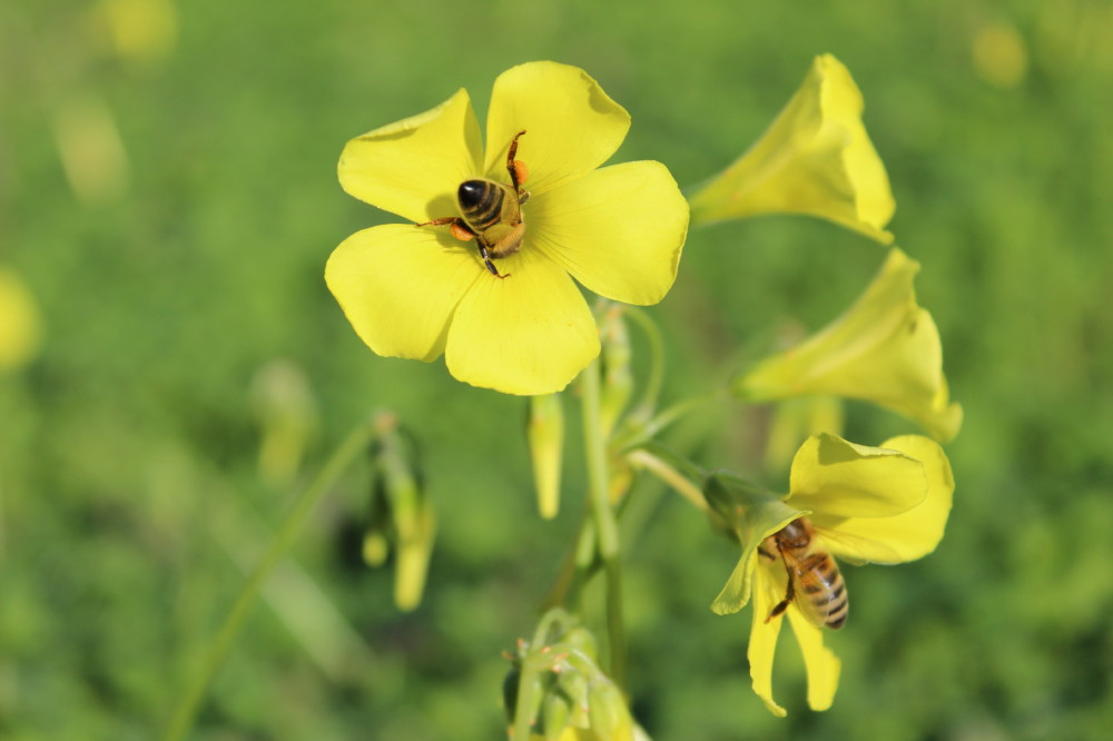 Oxalis pes-caprae or Bermuda buttercup is native to South Africa, and has been introduced elsewhere as a bee plant (for honey production) and an ornamental. Now, it is widely naturalized in many parts of the world, like here on Crete (Greece).