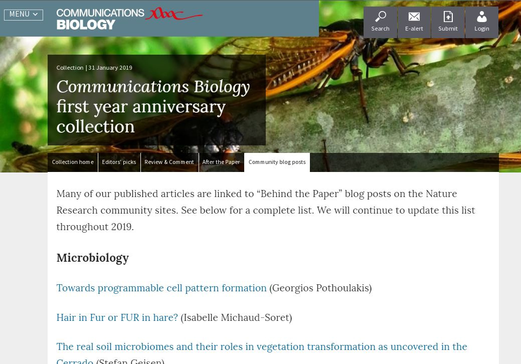 Our authors have contributed “Behind the Paper” posts to several of the Nature Research community sites: Microbiology, Ecology & Evolution, Bioengineering, and Chemistry. We invite you to browse the posts and our editors’ collection and be inspired by the diversity of research published at Communications Biology.