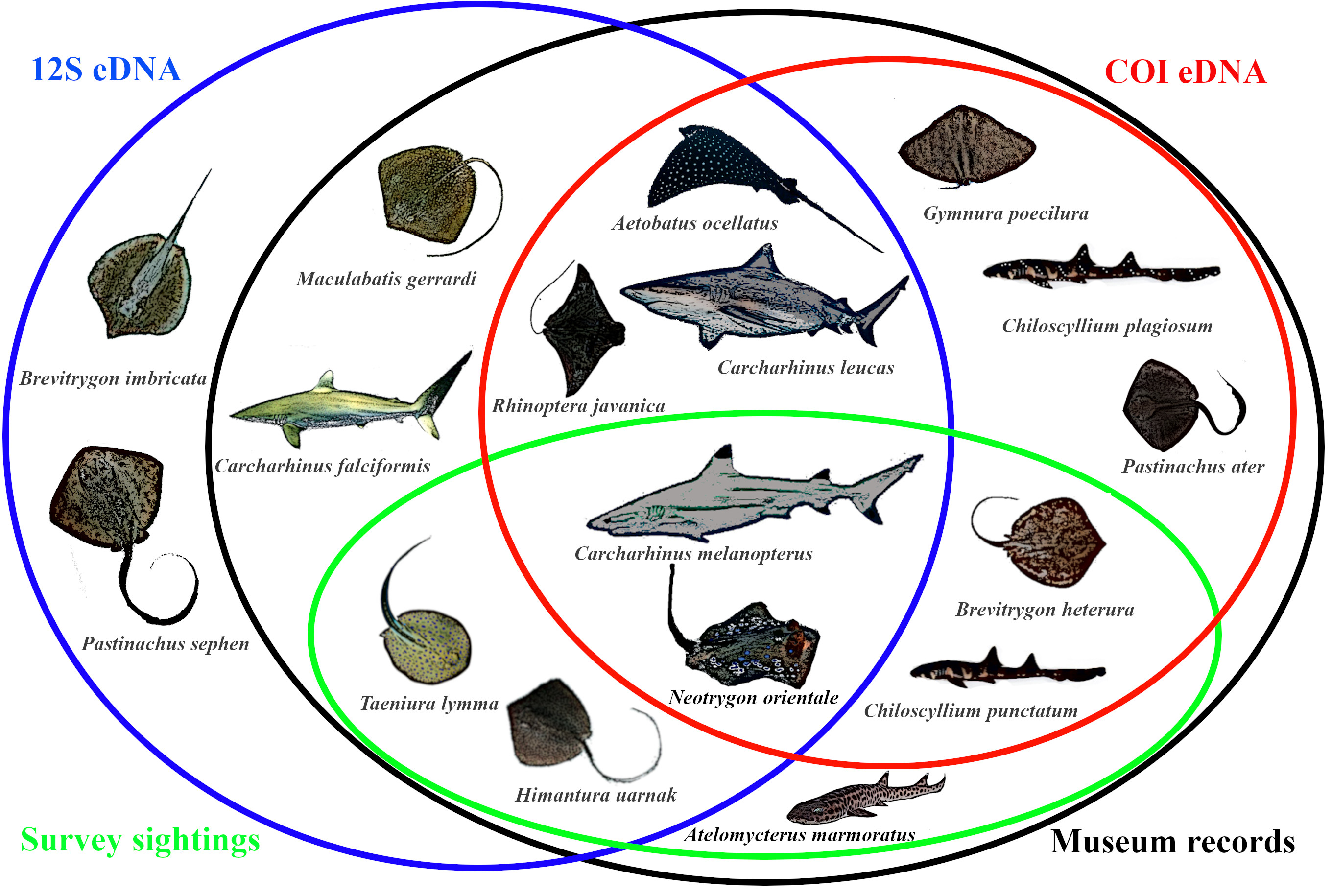 The most compelling result from our eDNA study was that we found up to 47 putative species, and managed to detect 16 sharks and rays with species-level identities. This is phenomenal, as eDNA found two times more species than the 7 (3 sharks and 4 rays) typically observed over the last twenty years. Comparing this updated species list from eDNA against the historical records, we found that the phantom diversity of sharks and rays have been considerably reduced by more than 20% after using eDNA. What is even more interesting is that our eDNA results uncovered two potential new species records! Of course, these records require further verification, possibly with evidence from sightings and proper identification of specimens by taxonomic experts. Nevertheless, the sensitivity of eDNA tools surpassing that of conventional sampling methods to uncover so much more elasmobranch diversity was extremely exciting for our team.
