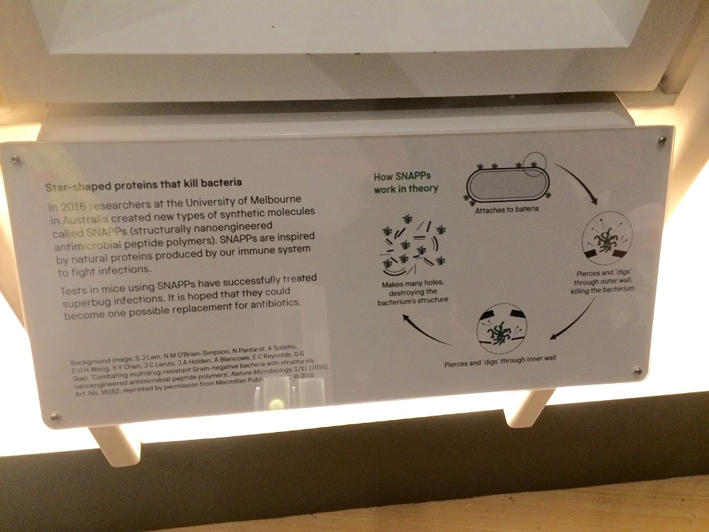 But it’s not all bad news. After setting the stage for a potential post-apocalyptic world where current drugs don’t work**, the rest of the exhibition showcases some of the steps being taken to tackle the problem. As a microbiologist, it was particularly rewarding to see basic research featured prominently on the walls, including studies exploring phages and predatory bacteria as alternative strategies to kill bacteria (yes, there is a whole section on Bdellovibrio). As part of the Nature Microbiology team, the highlight is clearly a section on SNAPPS (structurally nanoengineered antimicrobial peptide polymers) and how they are effective against Acinetobacter baumannii infections – you can read the full paper in our pages. On top of these alternatives to antibiotics, another section is dedicated to current efforts aimed at finding new antimicrobials, with a shout to the use of the iChip to discover teixobactin or the exploration of unusual sources - such as Komodo dragons, Icelandic fjords and Brazilian leafcutter ants - to find new drugs.