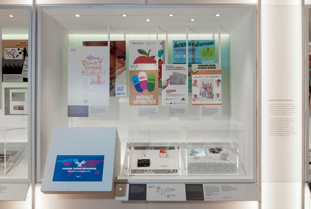 Perhaps more impressive than seeing the plates that encapsulate our enemies on this fight were the encounters with people on our side of the trenches, including those who faced the problem of antibiotic-resistant infections first-hand. That’s the case of Geoffrey Pattie, a cancer patient who in a video tells us the story about how while undergoing a surgery he contracted an infection with a strain of Klebsiella pneumoniae that was resistant to all currently used antibiotics, and as a result was left unconscious for 6 weeks and spent a total of five months in a hospital isolation ward to prevent his infection from spreading. A nearby display showcases the 14,000 pills that each individual must take during the two-year treatment needed to fight drug-resistant tuberculosis (for more, see here). Even for someone familiar with the AMR problem and with drug-resistant tuberculosis, these displays help to frame the issue in a different light, not one of number of cases and economic cost, but rather as a problem that affects people. Such a personal perspective is hard to ignore, particularly as one is then reminded that AMR today kills approximately 700,000 people annually and is projected to affect up to 10 million individuals every year by 2050 (that’s the whole population of a country the size of Portugal). To add to this sombre setting, the exhibit then highlights how we’re all part of the problem, cleverly displaying interviews that showcase how the general public often misunderstands antibiotics and their use, including by pushing doctors to overprescribe unnecessary pills or by taking them incorrectly. The final strokes in this gloomy picture come with the information that in this day and age antibiotic-resistant bacteria know no borders, so the AMR crisis truly is a global health problem.