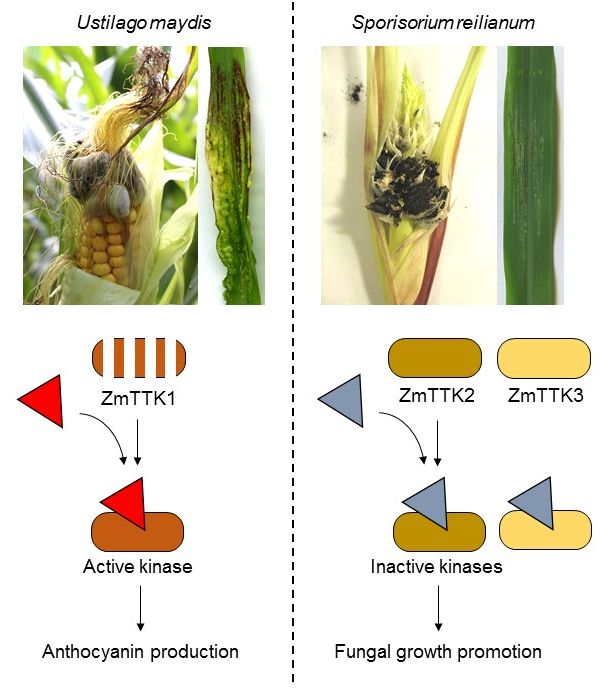Disease symptoms and Tin2 effector function in U. maydis and S. reilianum. U. maydis (upper part left) causes tumor formation and anthocyanin induction in all aerial parts of maize, while S. reilianum (upper part right) causes disease symptoms only in cobs and tassels of maize and fails to induce anthocyanin. Tin2 of U. maydis (red triangle) stabilizes the unstable maize kinase ZmTTK1, leading to anthocyanin induction. Tin2 of S. reilianum (blue triangle) inhibits the kinase activity of ZmTTK2 and ZmTTK3, leading to the promotion of fungal growth.
