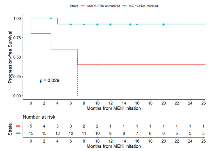 The response to MEK inhibitor therapy was 80%. We found that MAPK-ERK pathway mutation status highly correlated with responses as proven by the fact that the only 4 patients in whom a response was not observed were found to have additional driver mutations or mutations intrinsically resistant to the currently-available inhibitors.