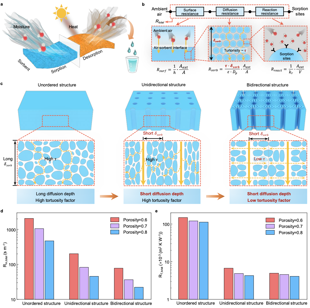 Fig. 1 Design of packed sorbents with superior water transport kinetics. a, Schematic of water sorption from air and water desorption from sorbent during water harvesting. b, Schematic of multi-step moisture transport during water sorption process. Water molecules transport from the ambient air to the external surface of sorbents by undergoing surface resistance (Rsurf), which can be tuned by the external airflow rate. Subsequently, the water molecules further diffuse along the connected intra pores by overcoming diffusion resistance (Rsorb), which is mainly affected by the tortuosity factor (τ), the diffusion depth (δsorb), and packed porosity (e). Finally, the water molecules are captured by the sorption sites of sorbents, mainly determined by the intrinsic reaction resistance (Rreact). c, Morphological evolution from unordered structures to ordered structures of packed sorbents with enhanced heat transfer and mass transport. d, Numerical results of the total mass transport resistances of different packed structures. e, Numerical results of the total heat transfer resistances of different packed structures.