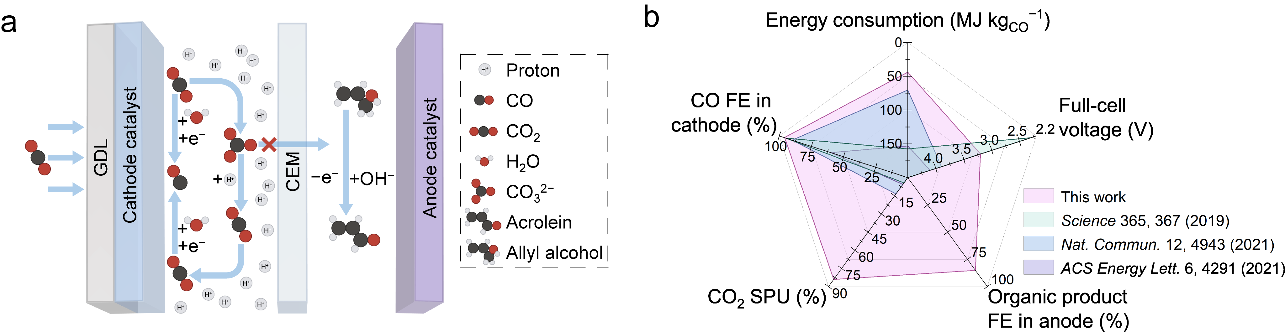 Figure 1. a, Schematic of a paired electrolysis system consisting of CO2-to-CO at cathode and allyl alcohol-to-acrolein at anode. b, Comparison of product selectivities at cathode and anode, full-cell potential, CO2 SPU, and energy consumption in this work with those of state-of-the-art CO2-to-CO ambient-temperature electrolysis systems.