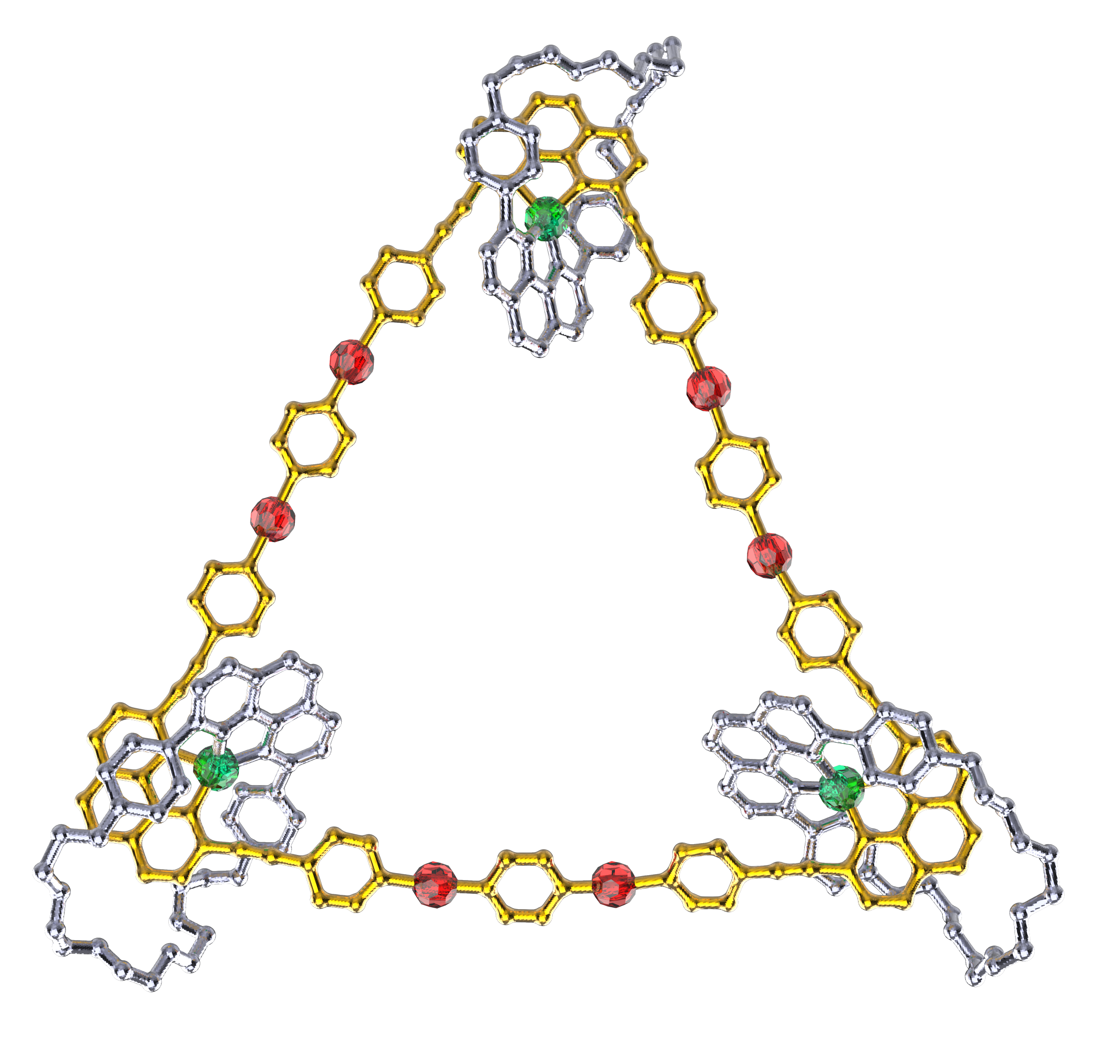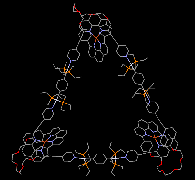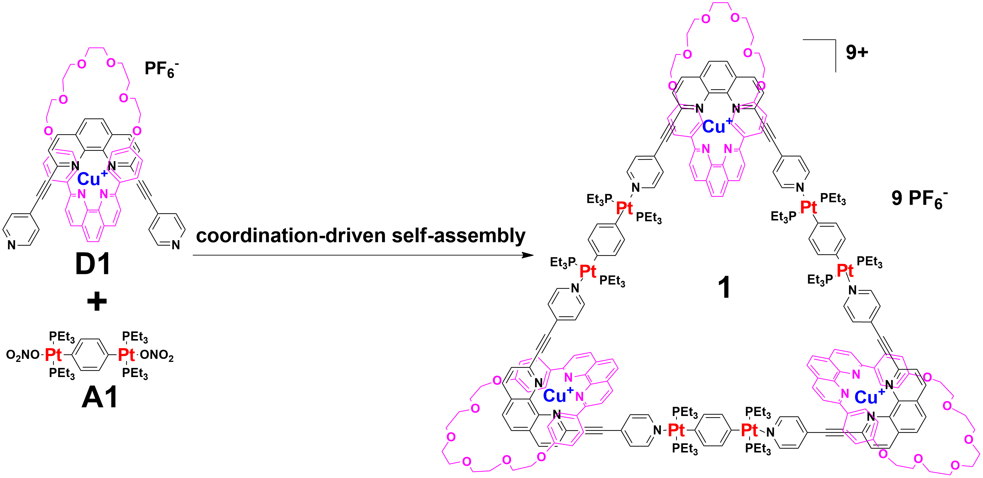 Our group in East China Normal University is specialized in supramolecular self-assembly at different scale based on platinum chemistry, mainly including platinum(II)‐pyridine coordination-driven self-assembly and platinum acetylide rotaxane dendrimers. Coordination-driven self-assembly has proven to be a powerful approach to construct a diverse range of supramolecular architectures including metallacycles, metallacages, and metal-organic frameworks (MOFs), through the combination of a range of diverse functional ligands and complementary metal salts. The intrinsic nature of coordination-driven self-assemblies, including their high dynamic metal–ligand coordination bonds, diverse metal ions, positively charged molecular nature, together with their highly tunable coordination geometries, endows them with great merits in biomedical applications. Under this premise, in this paper, an unprecedented heterometallic triangular necklace 1 containing Cu and Pt metals has been designed and synthesized via highly efficient coordination-driven self-assembly between pseudorotaxane D1 consisting of two functional ligands of pyridine and phenanthroline and diplatinum(II) acceptor unit A1 in nearly quantitative yield (Figure 1). The elegant structure of necklace 1 is successfully determined by X-ray crystallographic analysis, revealing that the finely arranged triangular necklace 1 has two racemic enantiomers in its solid state with intriguing packing motif.