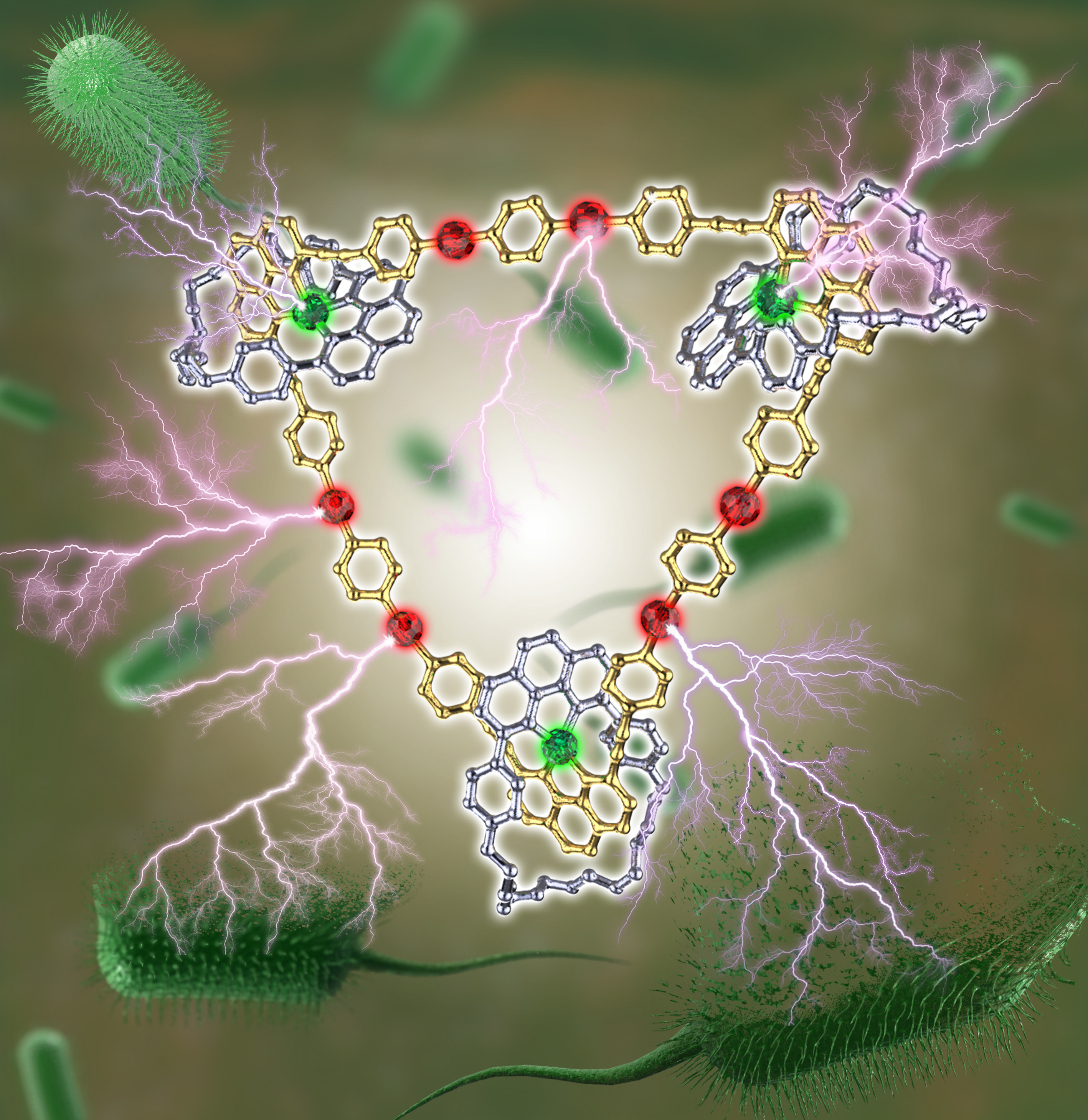 In collaboration with Prof. Qilin Yu from Nankai University, we have successfully demonstrated that the existence of two different metal centers not only facilitates the successful construction of necklace 1 but also endows it with superior nuclease properties and activities. More strikingly, the presence of the Cu(I) center and platinum(II), together with the coordination-based triangular framework, facilitates binding of necklace 1 to the cell surface components and disruption of the cell wall/plasma membrane in the bacterial cells (Figure 2). Consequently, the necklace 1 exhibited excellent bactericidal activity against both standard and clinical drug-resistant pathogens that are severely threatening human health, e.g., multidrug-resistant Pseudomonas aeruginosa, Escherichia coli, and Staphylococcus aureus. Further investigations revealed that the superior antibacterial activity of necklace 1 is mainly attributed to the highly positively charged nature, the possible synergistic effect of heterometals in the necklace, and the improved stability in culture media. The “threading-followed-by-ring-closing” approach combining with coordination-driven self-assembly would allow us to further construct more complicated molecular necklaces in the future. Moreover, the promising DNA cleavage and antibacterial activities obtained herein would also attract broad interests of chemists, material scientists, and biomedical scientists, and provide directions for future chemical design in the field of supramolecular chemistry.