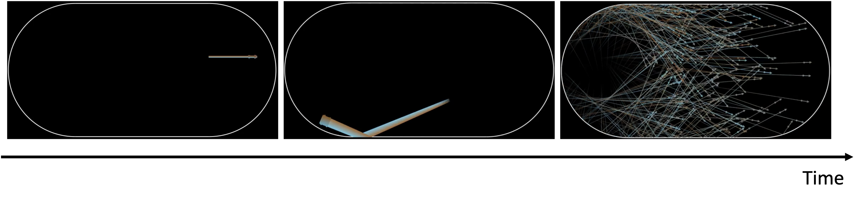 In the optical domain, a prominent example of complex systems is provided by chaotic optical microresonators, in which light exhibits chaotic ray dynamics such that a small deviation in the initial condition leads to an exponential divergence of trajectories [1]. Figure 1 demonstrates an example of optical chaos in a stadium-shaped cavity. Hundreds of light rays are launched towards almost the same direction inside the cavity. As time evolves, these rays start to separate from each other after traveling and being bounced by the boundary of the cavity. A long time later, they completely diverge and occupy the entire cavity, exhibiting a chaotic pattern.
