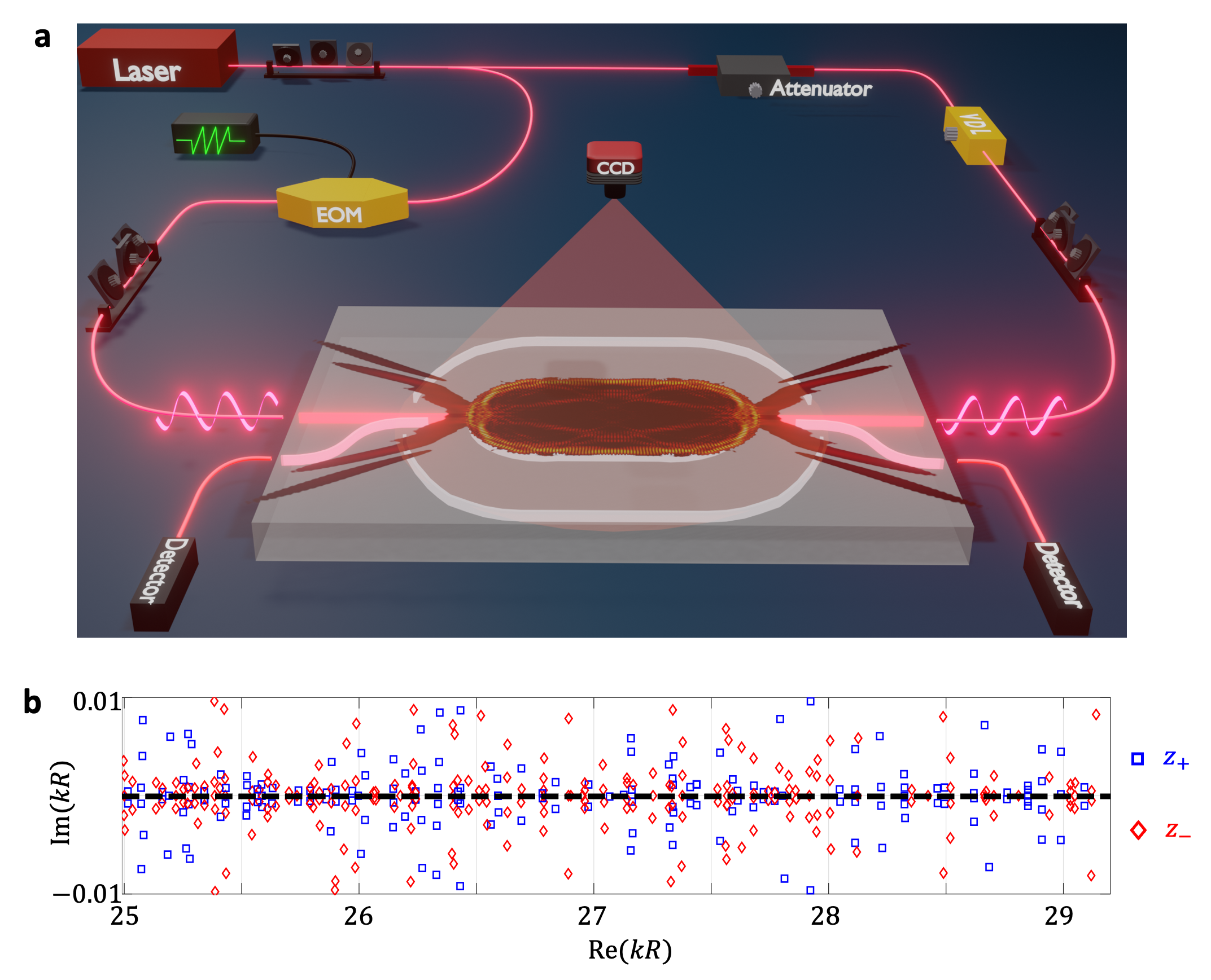 The chaotic cavity and the experimental setup used in this work are shown in Fig. 2 (a). Two nanowaveguides are fabricated connecting with the stadium cavity to couple the light in and out of the cavity. Without sophisticated cavity designs or loss channel engineering, we show that RSMs arise massively in this stadium-shaped microcavity due to chaos-induced abundant modes. As shown in Fig. 2(b), many reflection zeros (eigenvalues mentioned above) fall on the real axis (black-dashed line).