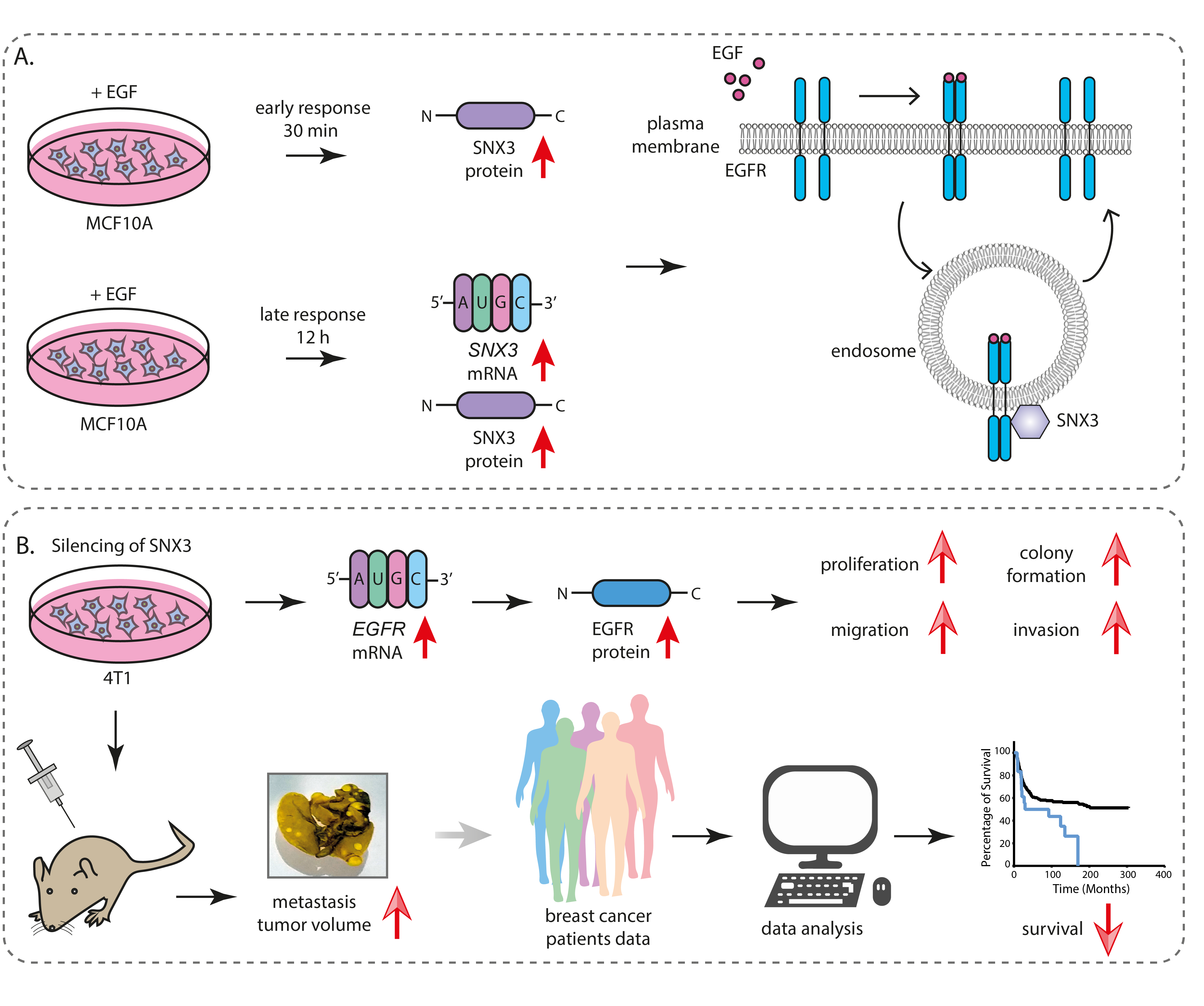 Interestingly, EGFR protein levels are highly sensitive to SNX3 loss. Transient RNAi models of SNX3 downregulation temporarily reduce EGFR levels due to decreased recycling of EGFR. In contrast, long-term silencing forces cells to recover and overexpress EGFR mRNA and protein, resulting in increased proliferation, colony formation, migration, invasion in TNBC cells, and increased tumor growth and metastasis in syngeneic models. In breast cancer patients, low SNX3 and high EGFR mRNA levels correlate with poor relapse-free survival.