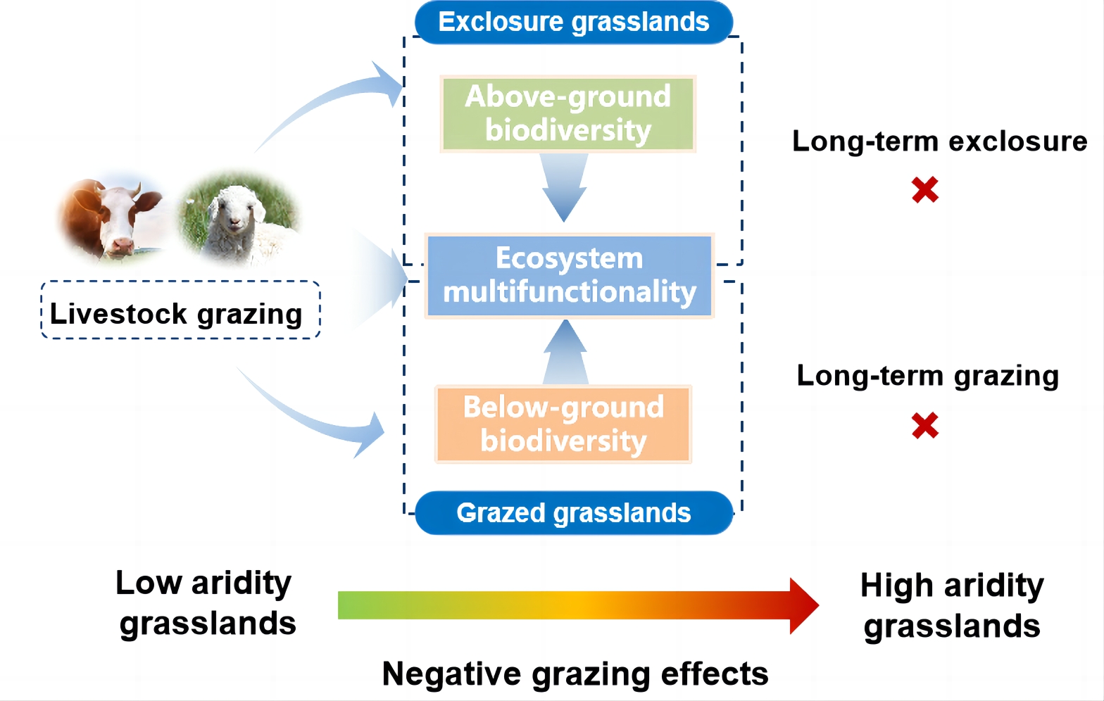 To our knowledge, this is the first large-scale multi-site experiment examining the effect of long-term domestic herbivore grazing on grassland biodiversity and ecosystem multifunctionality across an aridity gradient. Our cross-site work provides solid empirical evidence that relatively long-term impacts of managed grazing depend on site aridity, with the most arid sites experiencing more negative impacts on ecosystem multifunctionality. Our findings also provide field experimental evidence that aridity exacerbates the negative effects of long-term grazing on belowground biodiversity, and further strengthened their contributions to the decline in multifunctionality at arid grasslands. Thus, domestic herbivore grazing shifted the contribution for biodiversity drivers of multifunctionality from plant to soil biodiversity when moving from ungrazed to grazed ecosystems.