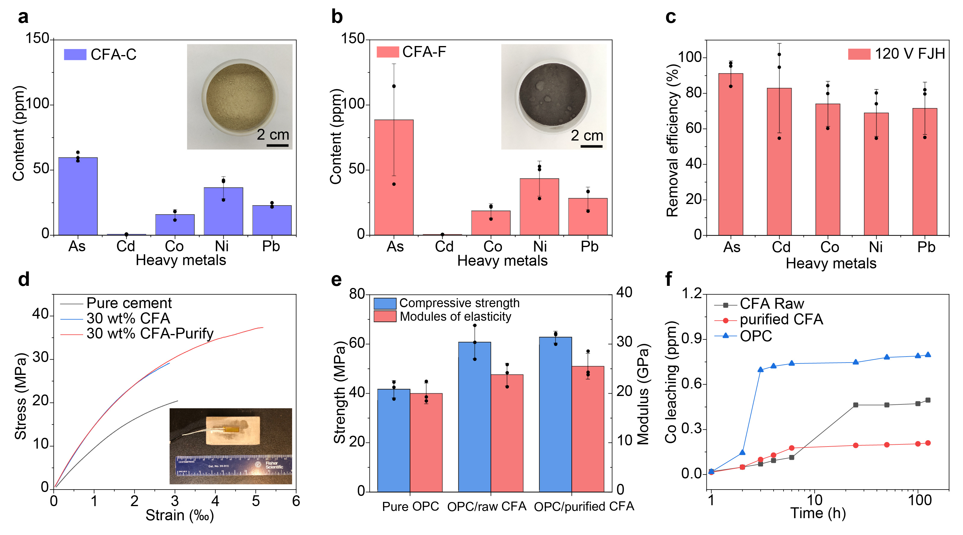 Figures 1. Removal of heavy metal from coal fly ash for low carbon cement. (a) Heavy metal contents in class C coal fly ash. (b) Heavy metal contents in class F coal fly ash. (c) Removal efficiency of heavy metals by a single flash Joule heating within 1 second. (d) Strain-stress curve of the coal fly ash substituted cement. (e) Mechanical performance of the coal fly ash substituted cement. (f) Heavy metal leakage test of the cement paste.