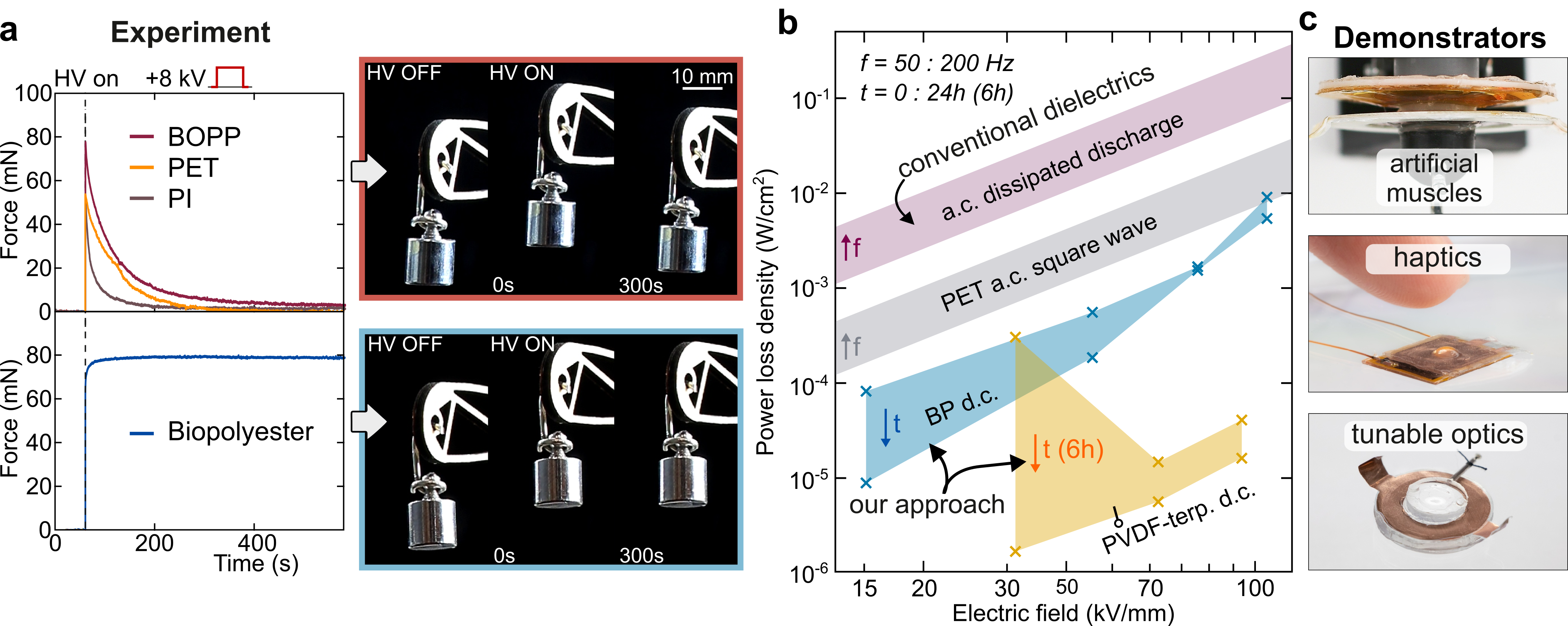 Addressing the energy efficiency of our approach, our team developed a methodology to assess the power losses both in conventional methods, as well as in ours. We realized that there are primarily two mechanisms behind the losses, energetic losses due to polarization, dominant in the case of high frequency polarity inversion, and losses due to conductivity, more significant in the constant voltage case. Additionally, in the case of polarity inversion, there are losses incurred during the discharging phases of the EMSs. Although the polymers we propose incur higher conductivity losses due to their leaky nature, remarkably, compared to conventional methods, the overall power consumption in this case is up to 1000 times (Fig. 2b).