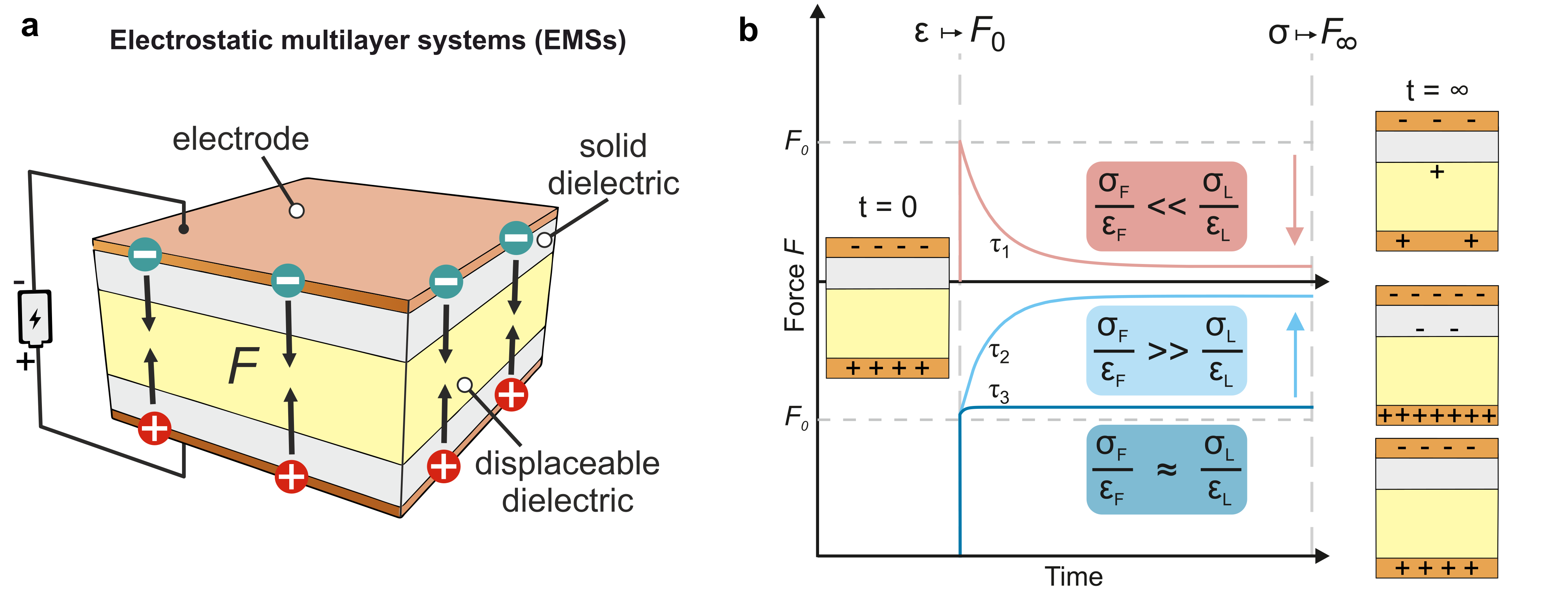 In previous works on the topic, scientists stumbled upon a heavily detrimental behavior of their EMSs prototypes: the actuation force drastically when these are driven with constant voltage. As we uncover in this work, this happens because both the insulating polymer films and especially the dielectric fluid have finite conductivity. As a result, under constant voltage conditions, the charges redistribute between different interfaces, altering the electric fields within the stacks and modifying the force. This effect, also known as Maxwell-Wagner-Sillars polarization, renders continuous quasi-static actuation (holding the force) under a constant voltage unfeasible (Fig. 1b, red curve and Fig. 2a top).