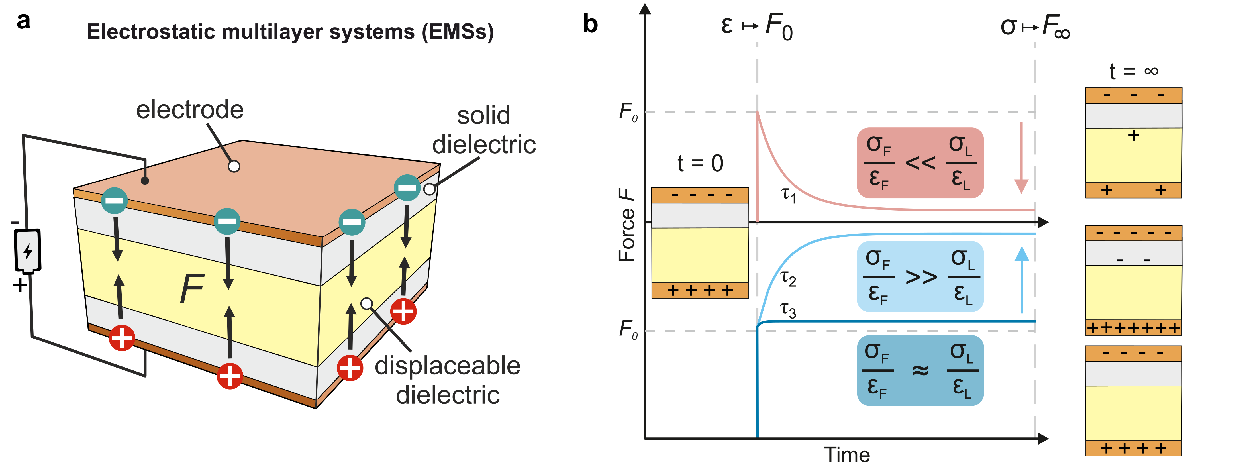 Some promising highly performant designs of electrostatic actuators, called electrostatic multilayer systems (EMS), employ a displaceable dielectric (oil, air), sandwiched between insulated and flexible electrodes (Fig. 1 a). By applying voltage, charges on opposite electrodes attract and squeeze out the fluid, allowing the actuators to contract, just like biological muscles. This principle allows designing configurations that function over vast frequency and force ranges, in various scales. Their low weight, quite operation, large energy per weight, and sustainable and recyclable nature, boosts EMSs beyond soft robotics and artificial muscles, forming the basis of numerous other applications, such as grippers, optical systems, haptic devices, airborne robots, and energy harvesters.