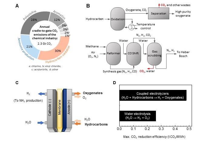 We postulate that that electrification and coupling of hydrocarbon-to-oxygenate conversion with H2 evolution reaction from water would be able to kill two birds with one stone (Fig. 1C). Using such coupled systems, the amount of CO2 emissions that can be saved per unit electricity will be doubled compared to conventional water electrolysis (Fig. 1D). Our calculations show that such coupled electrolyzer systems can potentially reduce 88% of emissions associated with hydrocarbon-to-oxygenate and ammonia manufacture. In comparison, electrical heating and conventional water electrolysis can only reduce up to 11% and 53% of associated emissions respectively. Even if renewable electricity is not available, these emissions can be reduced by up to 39% with the electricity mix in USA and China today.