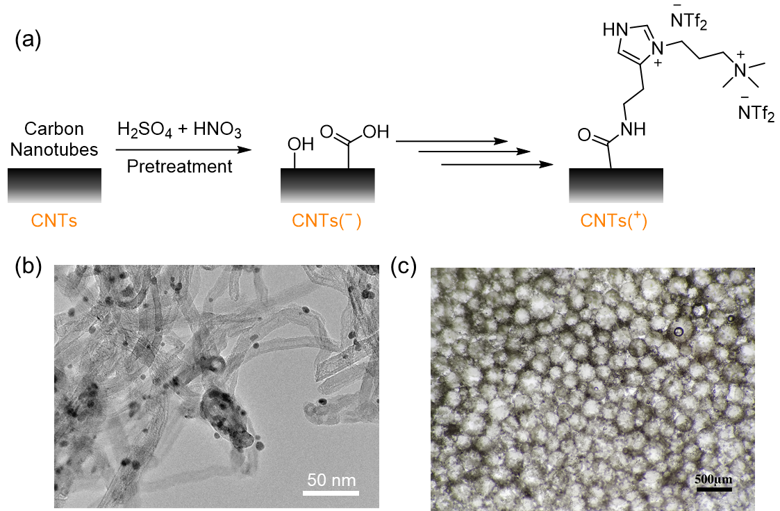 Figure 2. Synthesis and characterization of Pd/CNTs(+). (a) Pristine CNTs were treated with acids, forming negatively charged CNTs(−), which are then functionalized in multiple steps to positively charged CNTs(+); (b) transmission electron microscopy image of Pd/CNTs(+); (c) light microscope image of the Pd/CNTs(+)-stabilized Pickering emulsion.