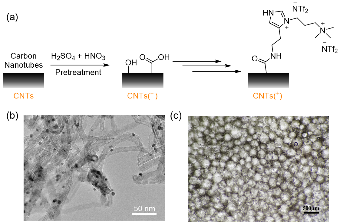 Figure 2. Synthesis and characterization of Pd/CNTs(+). (a) Pristine CNTs were treated with acids, forming negatively charged CNTs(−), which are then functionalized in multiple steps to positively charged CNTs(+); (b) transmission electron microscopy image of Pd/CNTs(+); (c) light microscope image of the Pd/CNTs(+)-stabilized Pickering emulsion.