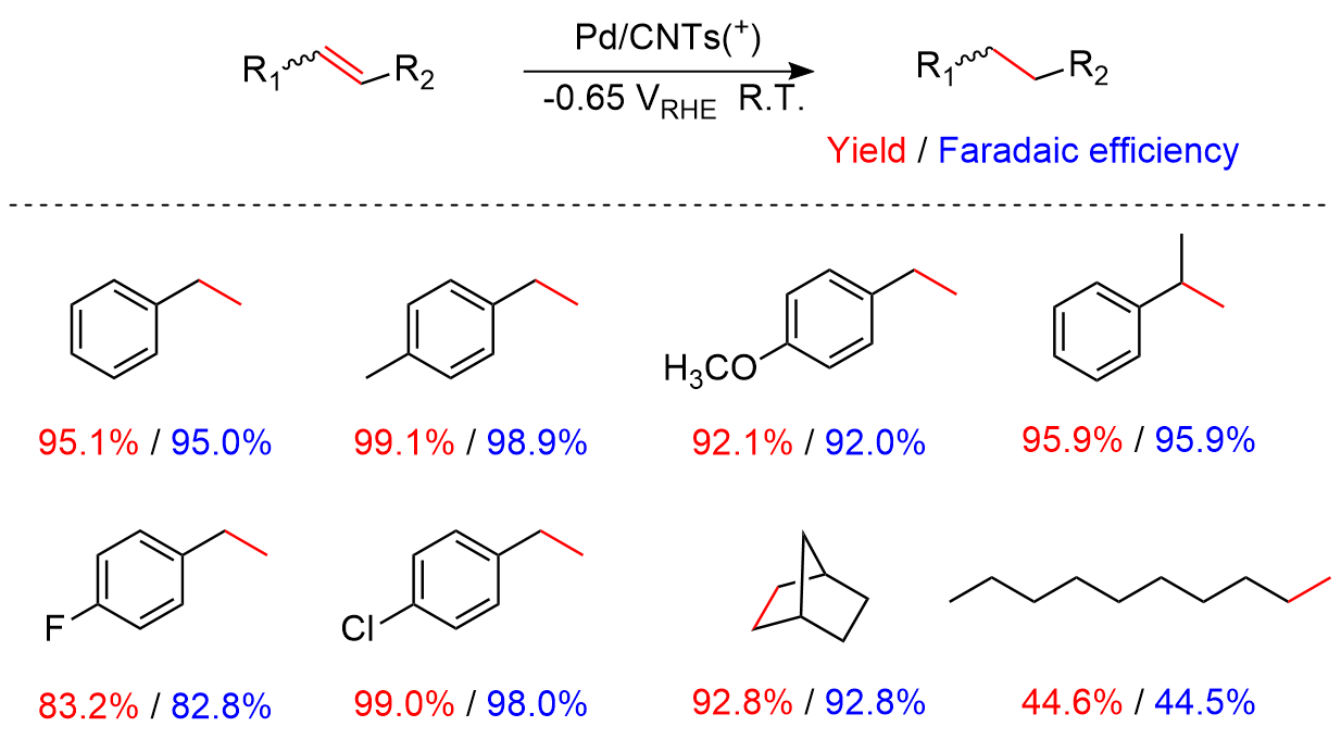 Similar high current densities and FEs could be reached for a variety of alkenes (see Figure 3 for some examples). Moreover, with styrene as a substrate it was also possible to work under neat conditions, without any additional organic solvent. As an additional benefit, the emulsion system enables facile product isolation, as organic and aqueous phase separate after filtering off Pd/CNTs(+). High purity products were readily collected after evaporating the cyclohexane (e.g. 86% isolated yield for the product of the ECH of 4-chlorostyrene). However, for long-chain aliphatic alkenes such as 1-decene, the product yield was lower due to double-bond migration and restricted accessibility of the resulting internal olefins for our ECH system.