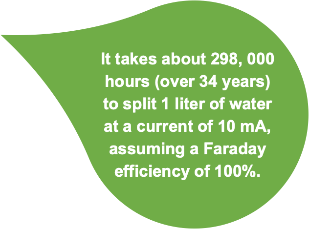Figure 1. It takes about 298, 000 hours (over 34 years) to split 1 liter of water at a current of 10 mA, assuming a Faraday efficiency of 100%. The hydrogen produced (0.11 kg) can only satisfy the energy consumption of one person for 1.4 hours, assuming a per capita energy consumption of 2500 W. In order to match the time span, we need 200 A even assuming continuous operation during night.