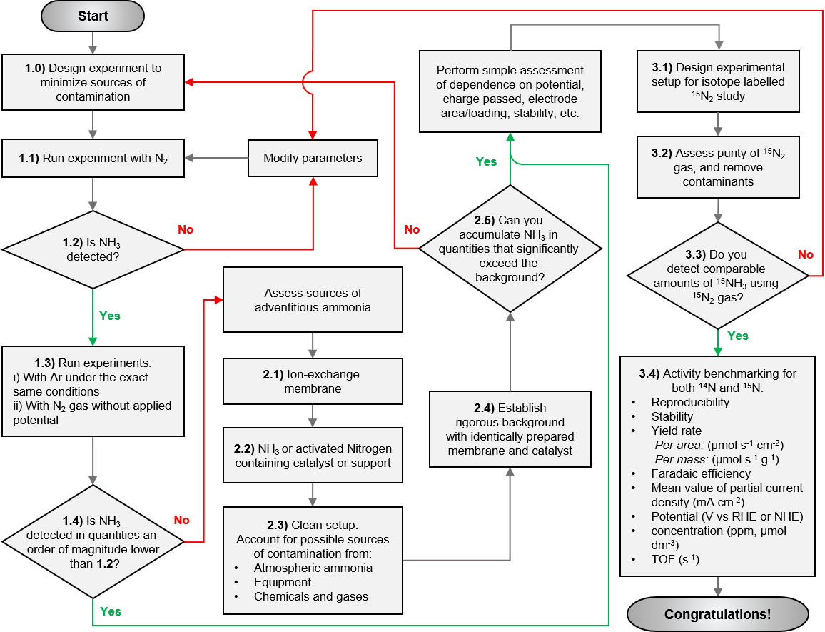 We therefore created this protocol in December 2017, with the idea of the flow chart borrowed from photocatalysis literature. We had plenty of results, which did not pass point (1.4), and therefore needed a positive result, which could pass all points, to prove the validity of the protocol. We started a systematic literature search; listing the execution of blank tests (if any) various papers had carried out, along with their results, converted to a comparable unit. We stumbled across an old lithium mediated process which had reported a very substantial production of ammonia, over a ppm, far higher than the background we commonly could measure when not being careful, although we noted a lack of isotope measurements in the report. At Stanford University, the Jaramillo and Cargnello groups combined had had some success repeating these measurements, and with our combined efforts, we were able to systematically confirm that the old reported procedure reproducibly makes ammonia, in separate laboratories, with all the required background tests.
